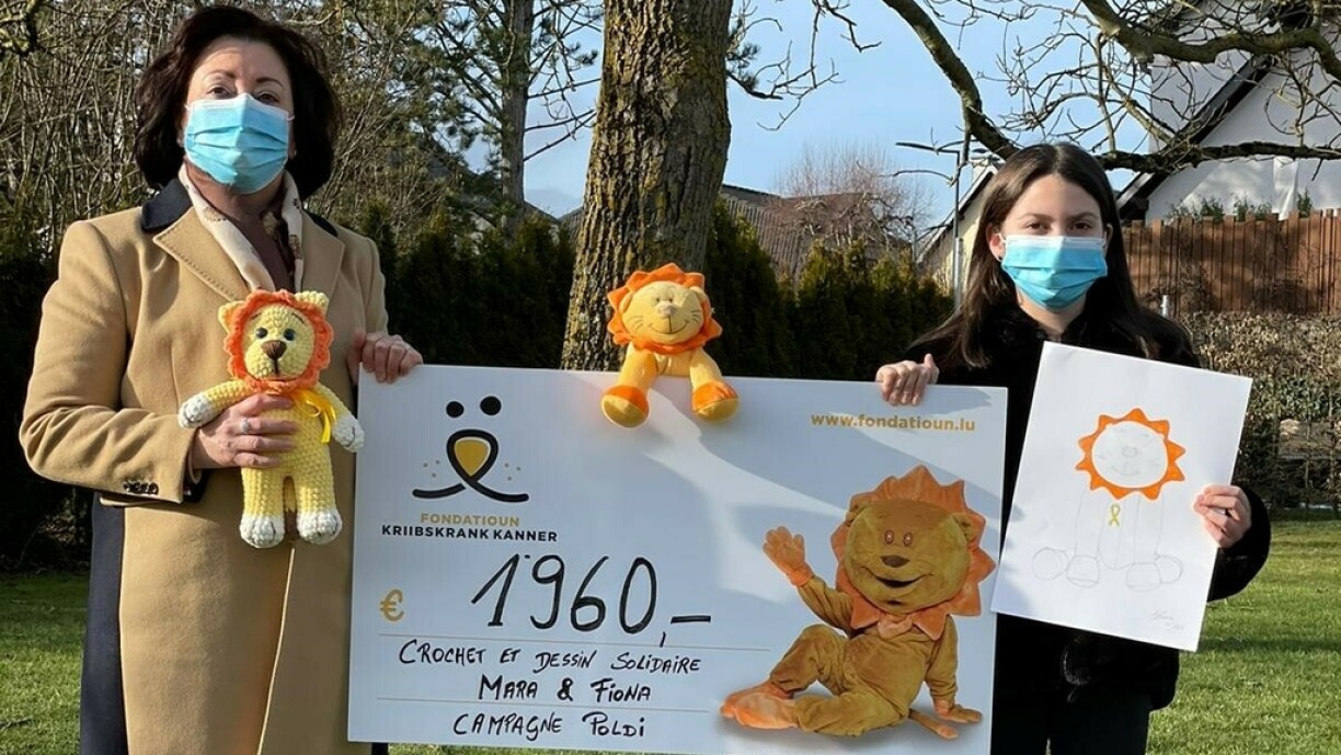 Esou ass déi stolz Zomme vun 1.960.-€ zesumme komm déi un d’Fondatioun Kriibskrank Kanner iwwerreecht ginn ass. Dësen generéisen Don hunn d’Mara an Fiona op d’Course Lëtz Go Gold 2021 gesat wou sie och eng Equipe opgemaach hunn. Dem Mara an Fiona läit et um Häerz dass d’Recherche vum Kannerkriibs ënnerstëtzt muss ginn, well nëmmen esou ass et méiglech besser Traitementer ze entwéckelen.www.fondatioun.lu
