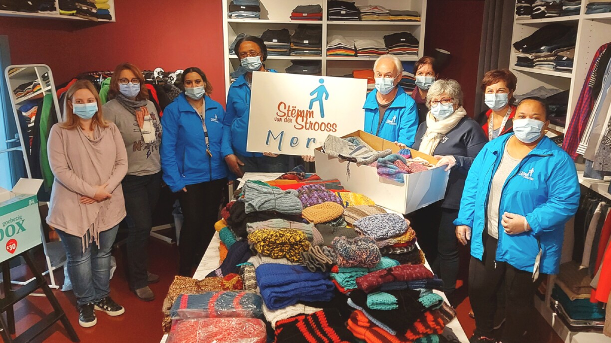 Im Frühing dieses Jahres hat der Club Senior Stroossen einen Aufruf gestartet unter dem Motto: Stricken und Häkeln für den guten Zweck. Für den kommenden Winter sollte die Stëmm vun der Strooss unterstützt werden, da hier in der kalten Jahreszeit ein großer Bedarf an unterschiedlichen Strickwaren besteht. Es meldeten sich 12 Damen, die fleißig zuhause während Monaten gestrickt und gehäkelt haben. Diese wertvolle Beschäftigung hat vielen von ihnen über die Isolation hinweggeholfen. Besonders in einer solch komplizierten Zeit war es wichtig zu wissen, dass man sich dennoch für andere einsetzen kann. Neben viel Wolle wurde auch eine ganze Menge Herzenswärme mit eingearbeitet. Mitte Oktober wurde alles im Club Senior gesammelt und so konnten fast 200 Einzelstücke, darunter über 90 Mützen, 60 Schals und 40 Armstulpen an Claude Consdorf, Verantwortliche der Kleiderstube in Hollerich auf der Nummer 7, rue de la Fonderie, weitergegeben werden.