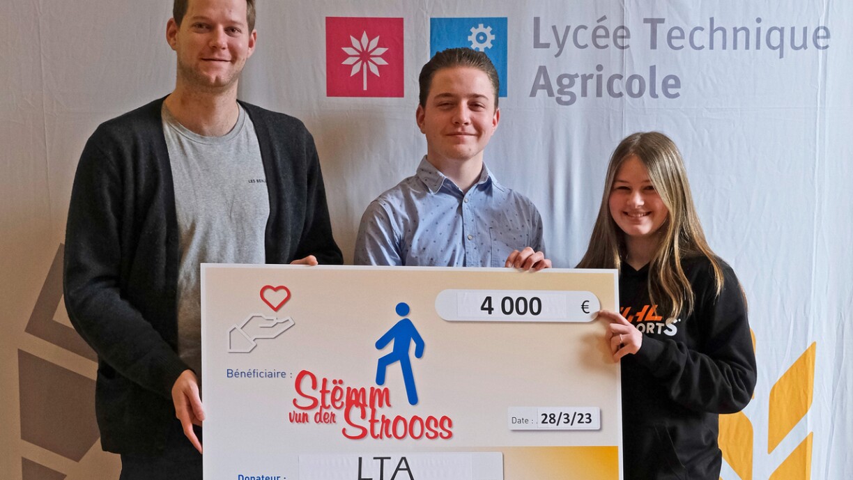 Das Lycée Technique Agricole Gilsdorf trägt zu den Projekten der Stëmm vun der Strooss bei. Vertreten durch Romain Tobes, stellvertretender Direktor des LTA, und Manon Roemen, Direktionsmitglied, überreichte die Schule am Dienstag, den 27. März 2023, einen Scheck im Wert von 4000 € an Bob Ritz, Kommunikationsbeauftragter der Stëmm.