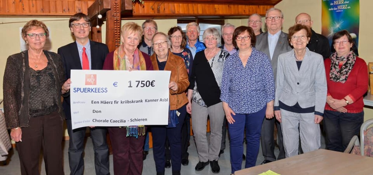 An d’Asbl “Een Häerz fir kriibskrank Kanner” seet och nach der Chorale Caecilia vu Schieren Merci fir hire generéisen Don vun 1.750 € aus dem Erléis vun hirem Concert national.