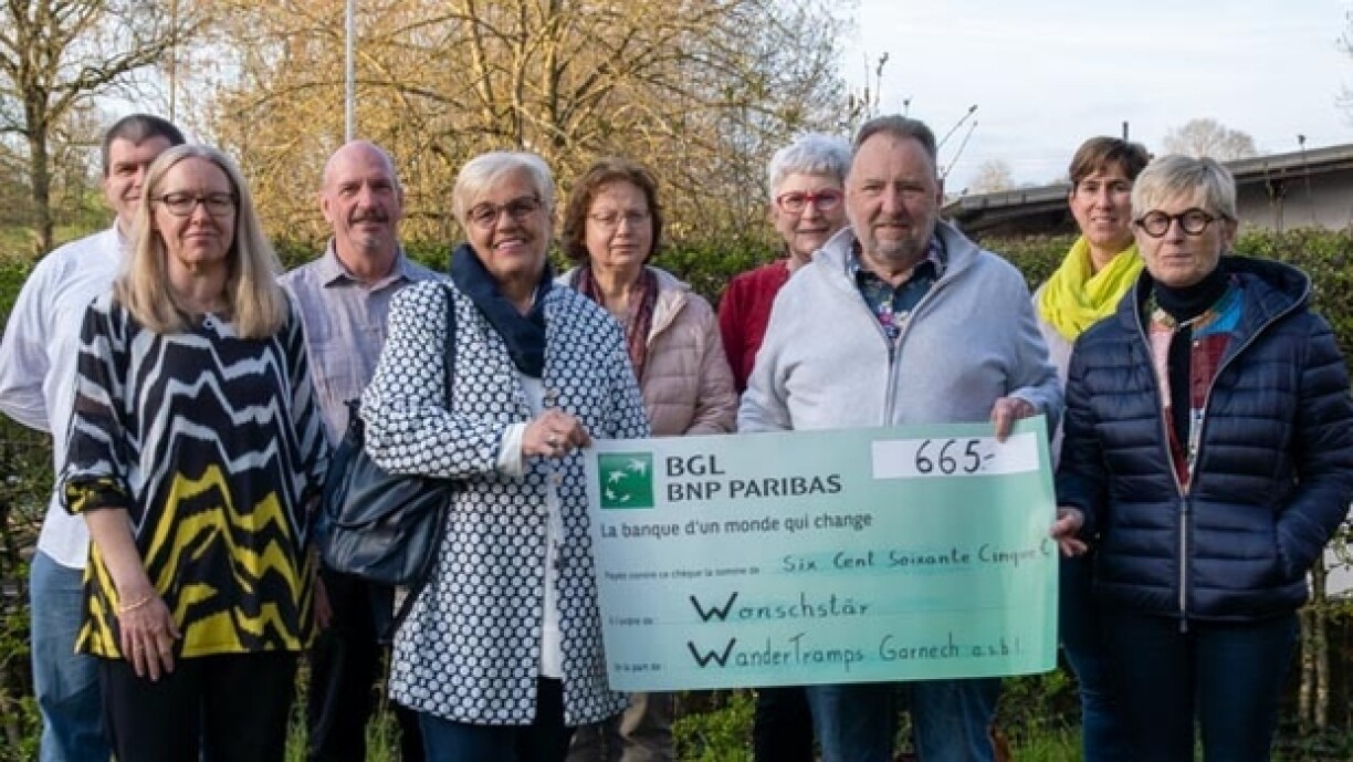 D’Wander-Tramps Garnich hun den 19.03.2023 an der Gemeng Garnech Bretzelen verkaaft, mat dem Gedanken fir all Bretzel 1 € un den WONSCHSTAER ze spenden. Et sin duerch den Verkaaf 100 € an zousätzlech Spenden vun 65 € vun de Leit erakomm. D’Wander-Tramps Garnich hun en Don vun 500 € gemach. Esou konnt den 27.04.2023 bei engem Pättchen an engem gudde Maufel e Scheck vun insgesamt 665 € un den WONSCHSTAER iwereecht gin.