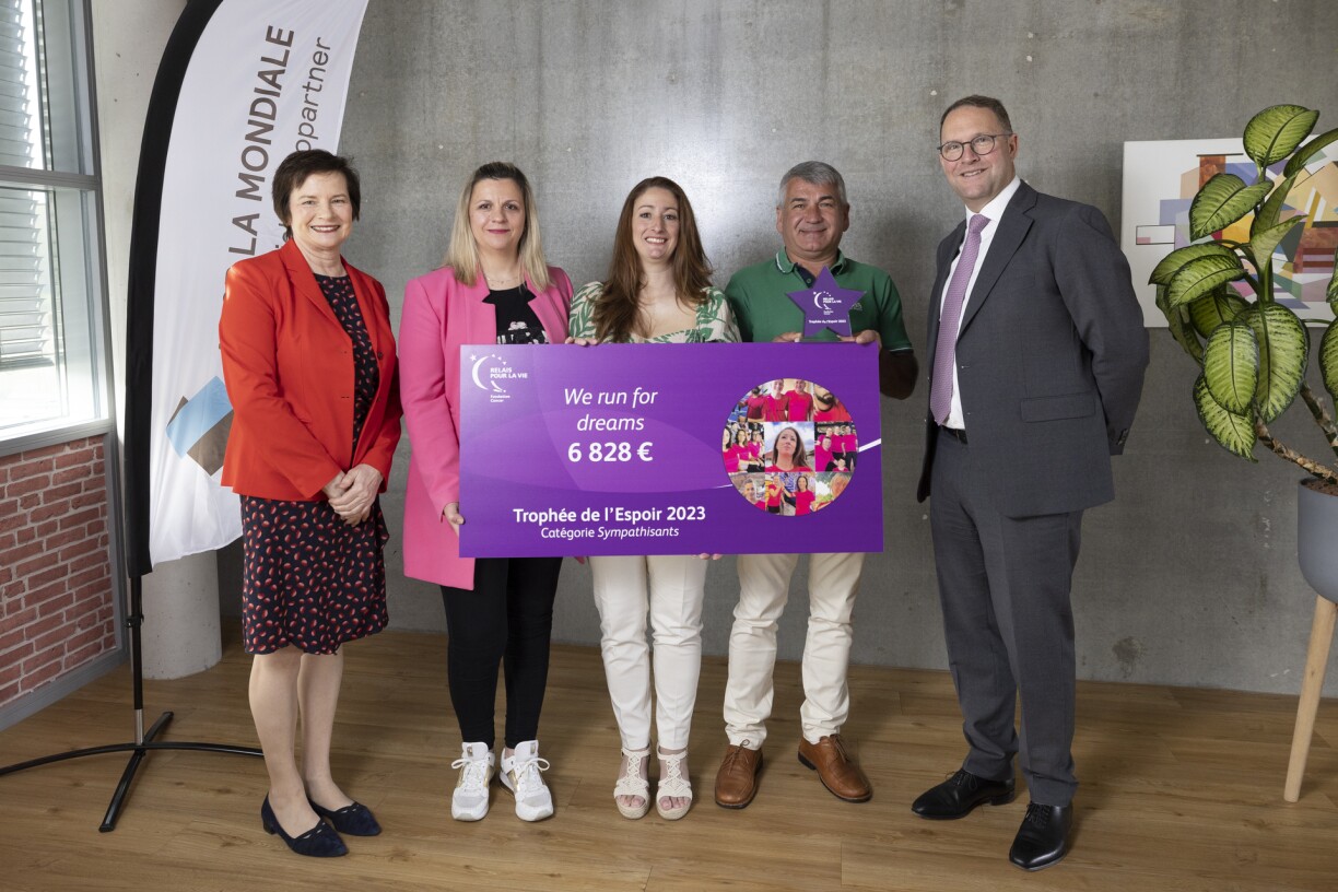 2 semaines pour monter une équipe et gagner les Trophées de l’Espoir dans la catégorie « Sympathisants » ? L’équipe « We run for dreams » l’a fait ! Ils se sont relayés tout le week-end pour montrer leur soutien à un proche atteint de cancer et ont récolté la somme de 6 828 €. C’est dans les Locaux de son entreprise que Loïc Le Foll – directeur du partenaire de la Fondation Cancer La Mondiale Europartner - AG2R La Mondiale - a eu le plaisir de remettre son Trophée de l’Espoir à cette équipe déterminée.
