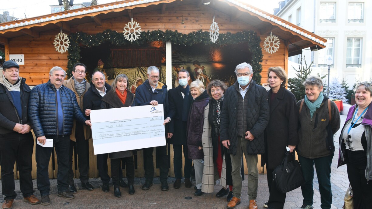 Le vendredi 17 décembre 2021, en présence du collège des bourgmestre et échevins de la Ville de Luxembourg, la « Chrëschtmaart asbl » a remis un chèque de 1.000 € à l’association « Fondation Autisme Luxembourg » : la somme a été récoltée grâce à la crèche installée sur la place d’Armes à l’occasion des Winterlights 2019.