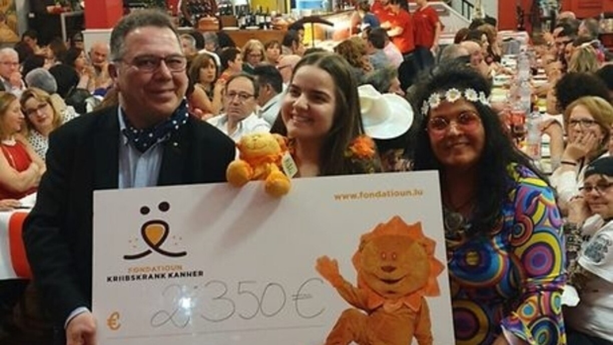 Madamm Margarida Gouveia an hiert Meedchen dem Cindy Gouveia konnten no enger kurzer Usprooch vum Romain Henrion ee Bénévol vun der Fondatioun Kriibskrank Kanner ee Scheck mat der stolzer Zomme vun 2350.-€ iwwerreechen .www.fondatioun.lu“