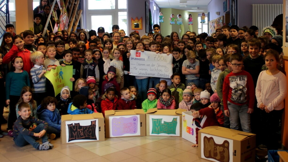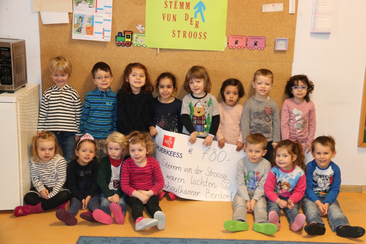 D’Hallschent vun de Suen, déi d’Kanner beim Liichtegoen opgehuewen hunn, insgesamt 780€, sinn och a Form vun engem Scheck bei där Geleeёnheet un den Marc Balthasar iwwerreecht ginn, deen als Vertrieder vun der “Stёmm vun der Strooss asbl” op Bäerdref an d’Schoul koum. Hien huet de Kanner en häerzleche Merci an e grousst Luef fir hier Solidaritéit ausgeschwat an hinnen erkläert, datt souwuel d’Séissegkeeten wéi och di vill Suen, déi si bereet waren ze spenden, bei der Stёmm vun der Strooss ganz néideg gebraucht ginn, fir deene ville Leit, deenen et hei am Land net sou gutt geet, ze hёllefen.