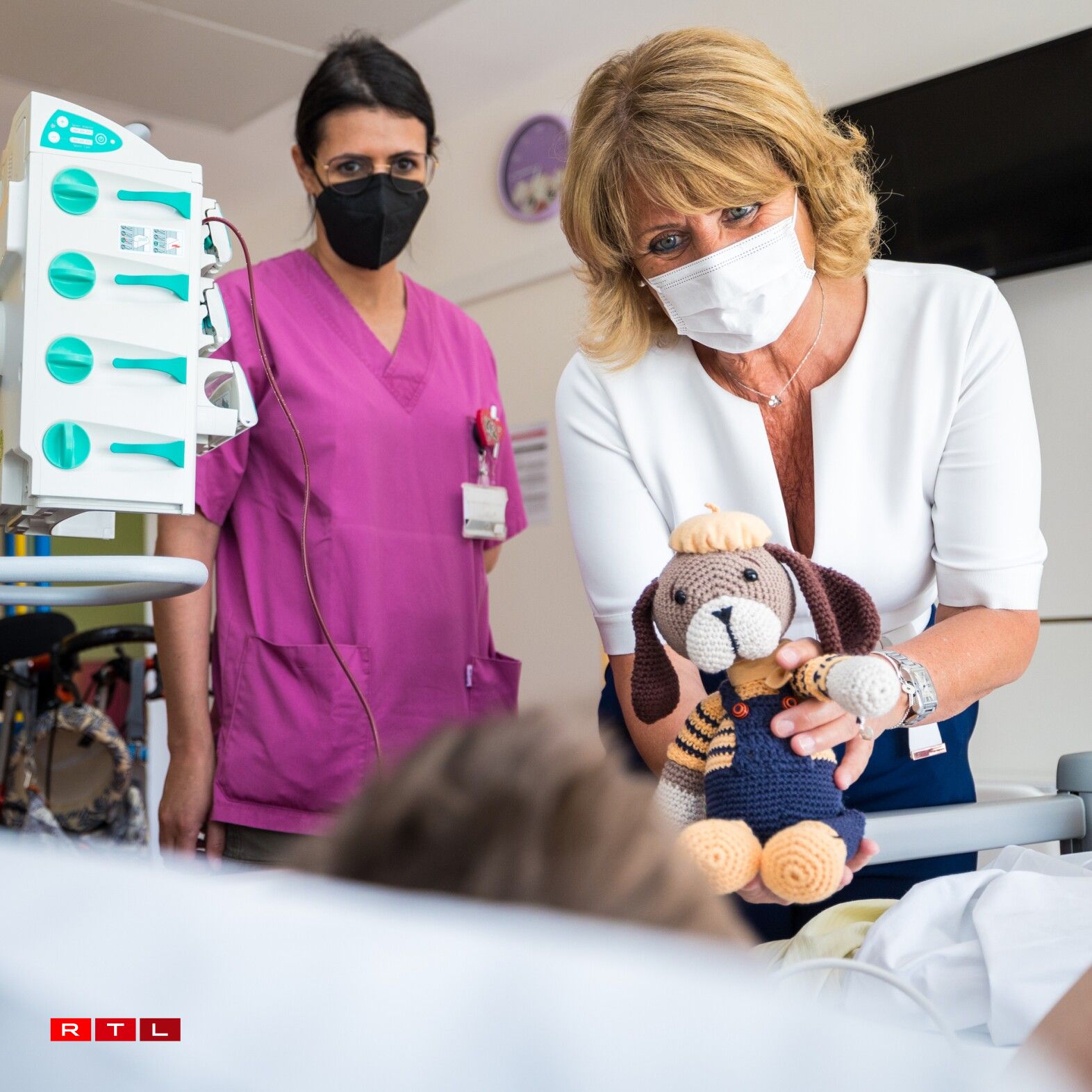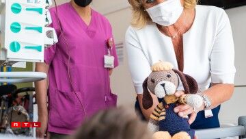 Télévie-Coordinatrice Diane Wunsch huet déi handgemaache Poppen an der Kannerklinick vum CHL un d'Kanner verdeelt.