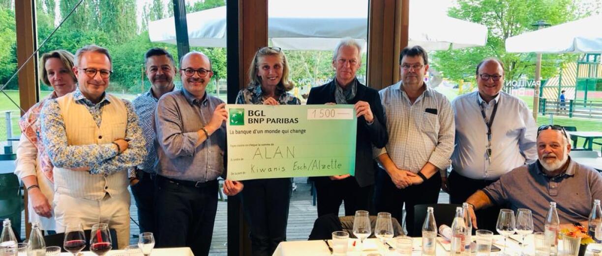 Es handelt sich um den Erlös eines im Februar 2019 von Kiwanis Esch-Alzette organisierten Benefizkonzertes des « Ensemble Vocal VIVACE », im Theater in Esch-Alzette. Die Kleiderbörse Asbl erklärte sich danach bereit weitere € 200.- zu spenden. Als Dank überreichte Fernand Misteri, Mitglied des Service Clubs Kiwanis-Esch-Alzette und Eigentümer der Firma Misteri Fernand Sàrl noch den Betrag von € 500.- an den Dirigenten des Gesangsensembles Uli Evrard. Constant Müllesch, amtierender President vom Kiwanis-Esch-Alzette bedankte sich danach herzlichst bei den Vertretern von VIVACE, Presidentin Carmen Kayser, Dirigent Uli Evrard und Sophie Gidt, der Kleiderbörse, Karin Bintner, sowie bei seinen Mitgiedern und gab das Wort dann an Shirley Feider-Rohen, Vorsitzende von ALAN Asbl, die in einem interessanten Vortrag Sinn und Zweck der im Jahre 1998 gegründeten Vereinigung erklärte und auch erläuterte dass die Vereinigung in erster Linie auf private Spenden angewiesen ist.