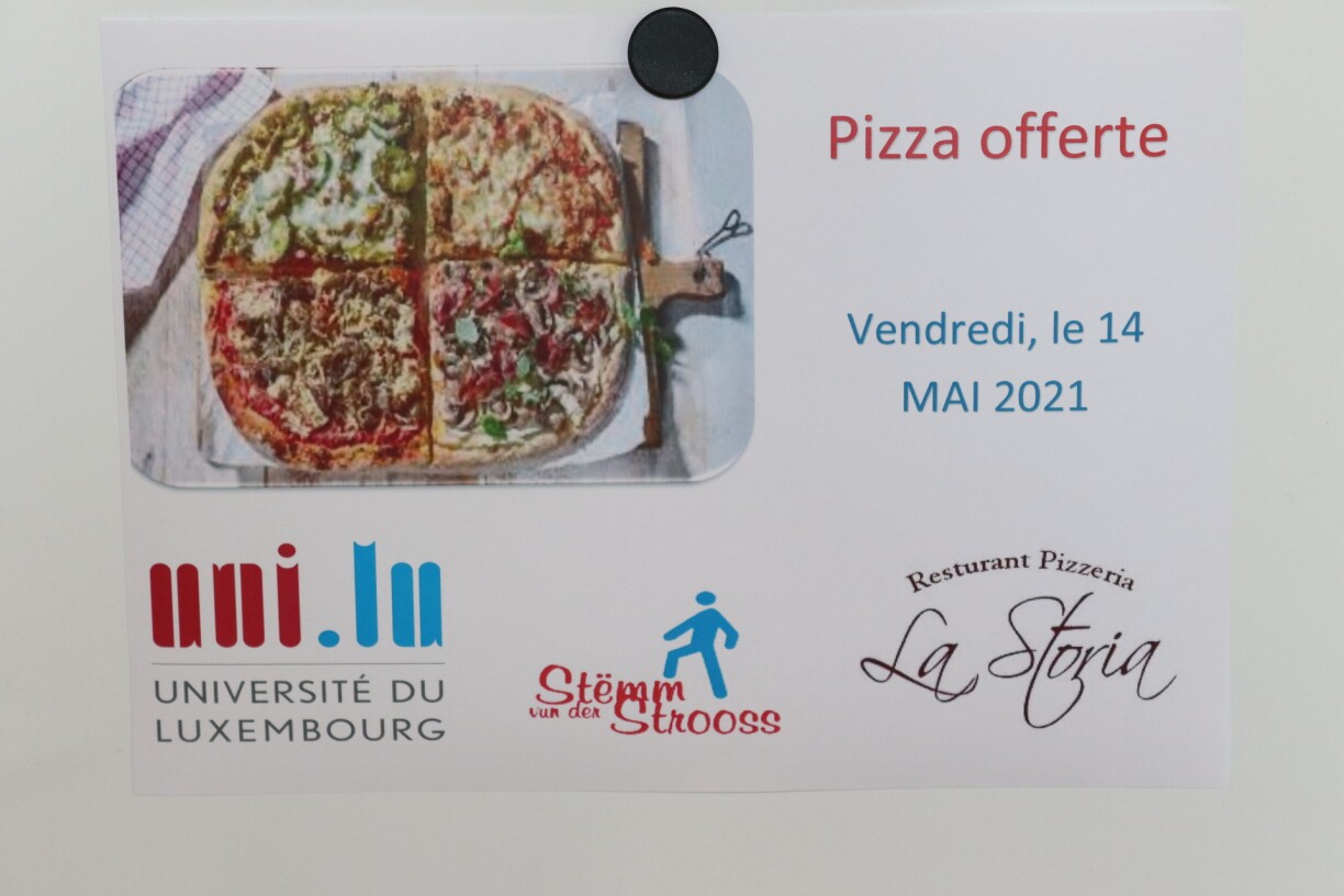 Die Essensgutscheinen wurden am 1. April an Francesco Settanni, Verantwortlicher für den Standort Stëmm vun der Strooss in Esch an der Alzette, übergeben. Diese großzügige Spende ermöglichte es, am 14. Mai dank der Unterstützung des italienischen Restaurants La Storia in Esch an der Alzette einen „Pizza-Tag“ für benachteiligte Menschen zu organisieren und ihnen so ein geselliges Essen zu bieten. Insgesamt wurden 81 Pizzen ausgeliefert und so konnten 104 Personen sich fühlen als seien sie in einem Restaurant. Mit denen von C²DH erhaltenen Essensgutscheinen, werden in Zukunft weitere Mittagessen dieser Art organisiert.