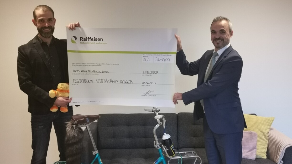 De Luc Mergen konnt mat groussem Stolz der Fondatioun Kriibskrank Kanner ee Scheck an Héicht vun 3035.-€ iwwerreechen.