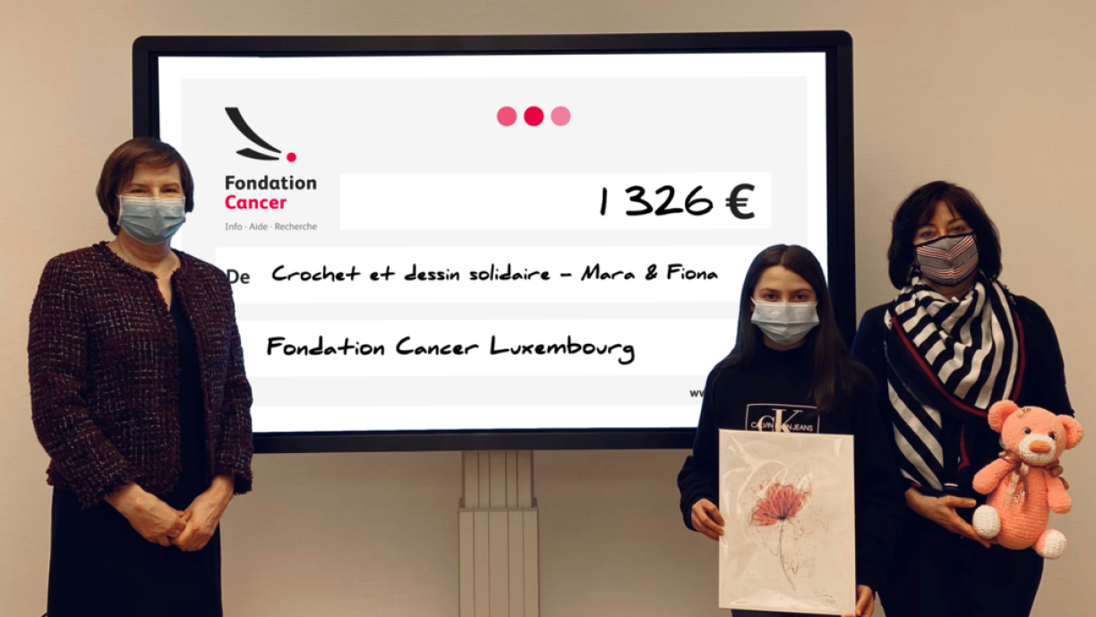 Si verkafe selwergemaachen Heekel-Kreatiounen a gemoolte Konschtwierker op dëser Ausstellung. Duerch dës Aktioun konnt eng Zomm vun 1.326 € un d‘Fondation Cancer iwwerreecht ginn.