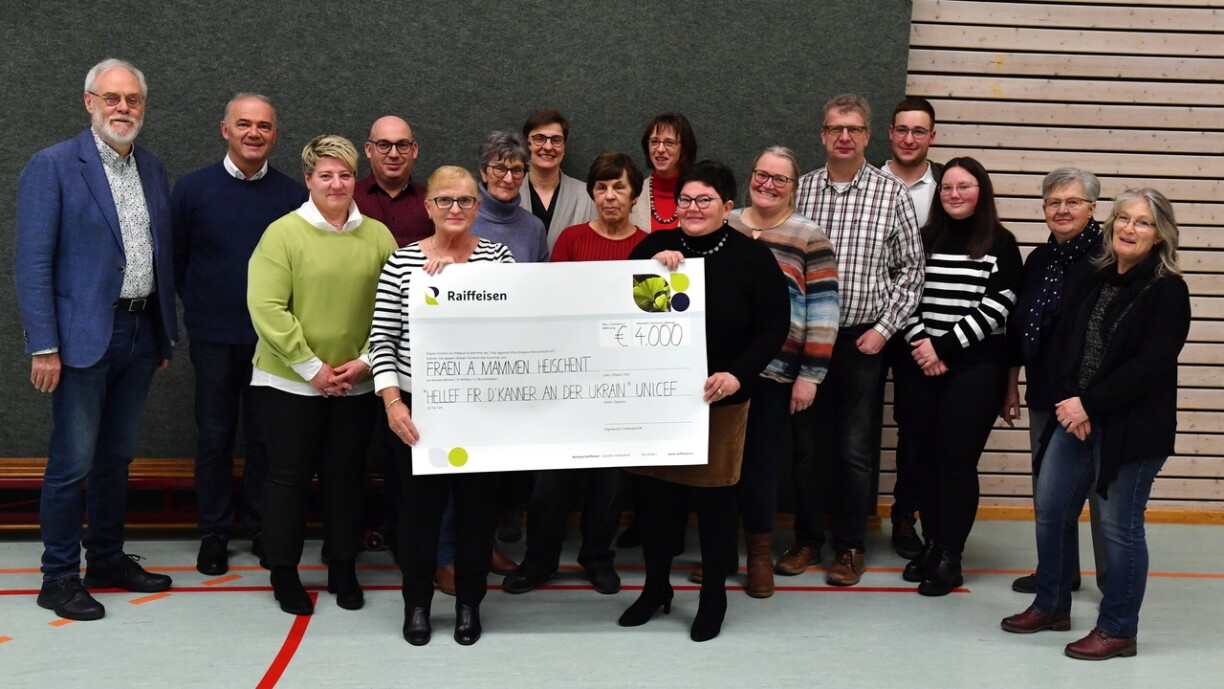 Och mam Verkaf vu selwer gebastelte Chrëschtdekoratiounen ass bei de Leit op grousst Interesse gestouss. Am Kader vun der Scheckiwwerreechung di viru kuerzem an der Buvette vum Tennis zu Heischent stattfonnt huet, ass an treffende Wieder, op den oprichtige Merci un all benevole Memberen, de Komitteesleit mat alle Bedeeligten fir hiren tatkräftigen Aasatz bei desem Adventsevent higewisse gin. De Scheck vun 4 000 Euro, den den Erléis vum Dag duerstellt, geet un d’Unicef „Hëllef fir d’Kanner an der Ukrain“. Souwuel wi den Abbé Marco Wehles wi och de Buergermeeschter Marco Schank an hire jeweiligen Rieden erviergestrach hun, konnten die eifrig Fraen a Mammen no zwee Joer Pandemie mat hirem Fest eppes positives Bewierken, fir d’Leit no deser laanger Zäit nees beieneen ze kréien. Duefir gehéirt hinnen Alleguerten, Respekt an Unerkennung fir hirt Engagement déi sech och duefir asetzen fir noutdierftig Kanner ze ënnerstëtzen. Eng Traditioun, déi an Zukunft och weidergefuert soll gin, an och vum néidigen Erfolleg soll belount gin.