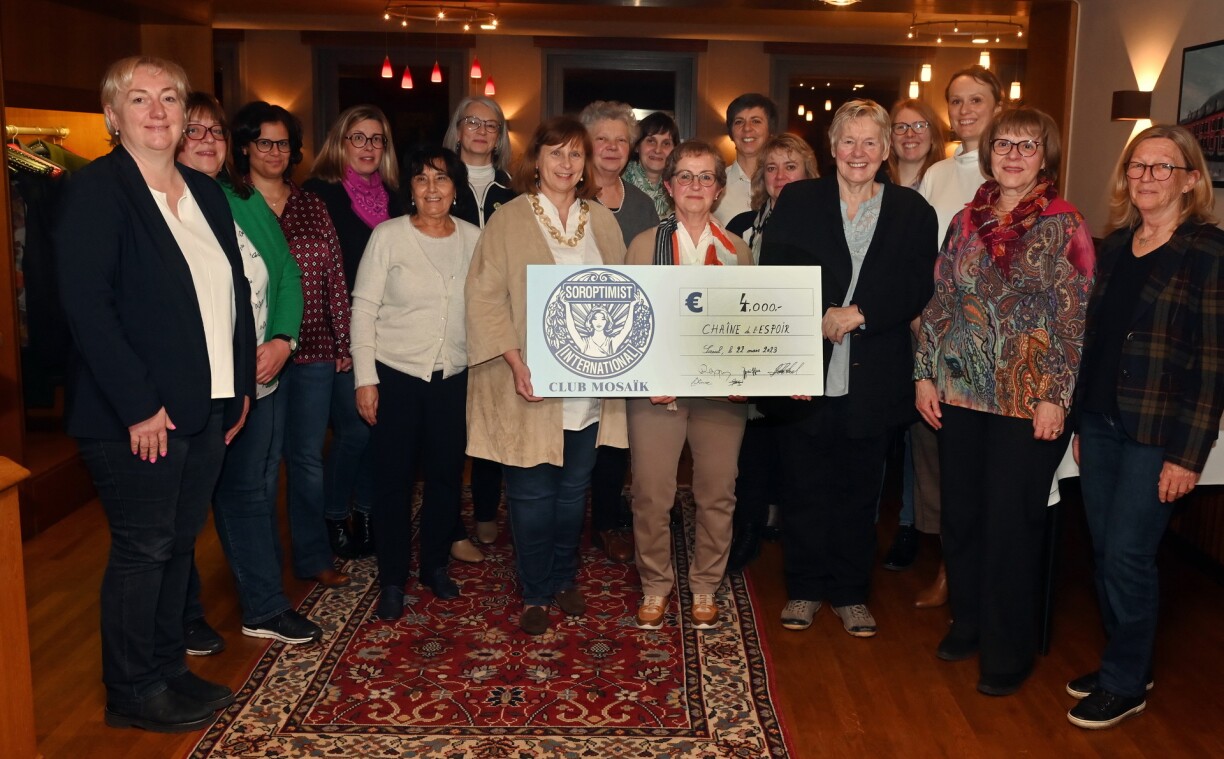 Club Soroptimist Mosaik ënnerstëtzt de Centre Hospitalier am Senegal Scheck vun 4 000 Euro iwerreecht Sëll: Vu, dass et den Objektif vun den Soroptimisten ass, fir de Fraen an de Kanner héi am Land souwi och am Ausland bäizestoen, waat ënner aanerem d’Gesondheet an d’Bildung ubelaangt, hunn Soroptimisten vum Club Mosaik Kanten Réiden sech derzou entschloss, fir en Deel vun hire Recetten vum lëschte Joer weider ze leeden. Am Kader vun enger Feierstonn am Haaptsëtz zu Sëll gouf de Scheck vun 4 000 Euro zesummen mat hirer Presidentin Rose Dax un Directrice vun der „Chaîne de l’Espoir“, Dany De Muyser, iwerreecht. Dess Suen verbonnen mat engem ganz grousse Merci, droen derzou bäi fir de Centre Hospitalier Albert Royer am Senegal nei op- an anzeriichten. An der Klinik gin haaptsächlich Kanner intensiv behandelt. (CR) (Foto: Charel Reiser)