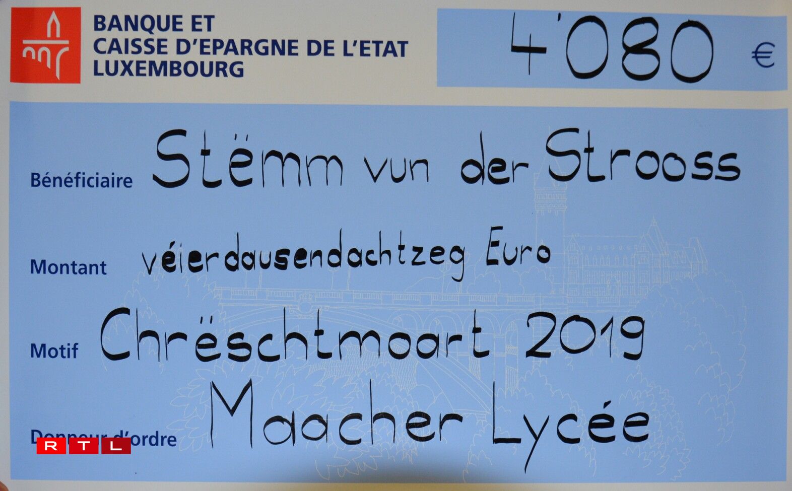 Ermöglicht wurde diese großzügige Spende durch den Erlös des Weihnachtsmarktes, der am 16. Dezember 2019 im Maacher Lycée stattfand. Es ist hervorzuheben, dass die gesamte Schule, und somit alle Klassen und deren Lehrer, an der Aktion teilgenommen haben, um so diesen riesigen Geldbetrag zu sammeln. Leider konnte aufgrund der COVID-bedingten Maßnahmen kein geeigneter früherer Termin für besagte Schecküberreichung gefunden werden.