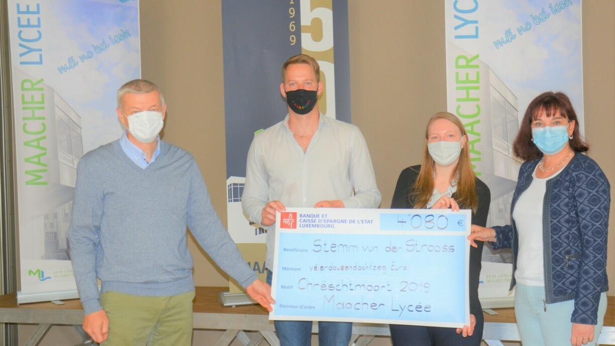 Die Wohltätigkeitsvereinigung (ALYGRE) des Maacher Lycée trägt zu den neuen Projekten der Stëmm vun der Strooss bei. Vertreten durch Herrn Yves Mentgen, stellvertretender Direktor des MLG und Frau Chantal Eicher, Professorin am MLG und Präsidentin der ALYGRE, überreichte die gemeinnützige Vereinigung am Montag, den 17. Mai 2021, einen Scheck über 4.080 € an Bob Ritz, Kommunikationsbeauftragter der Stëmm vun der Strooss. Eine Gruppe von Schülern nahm an der Schecküberreichung teil und verfolgte aufmerksam eine Präsentation der Aktivitäten der Stëmm.