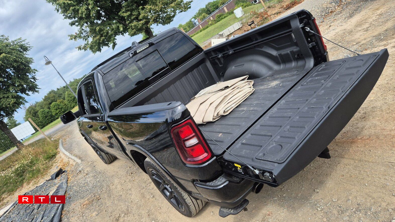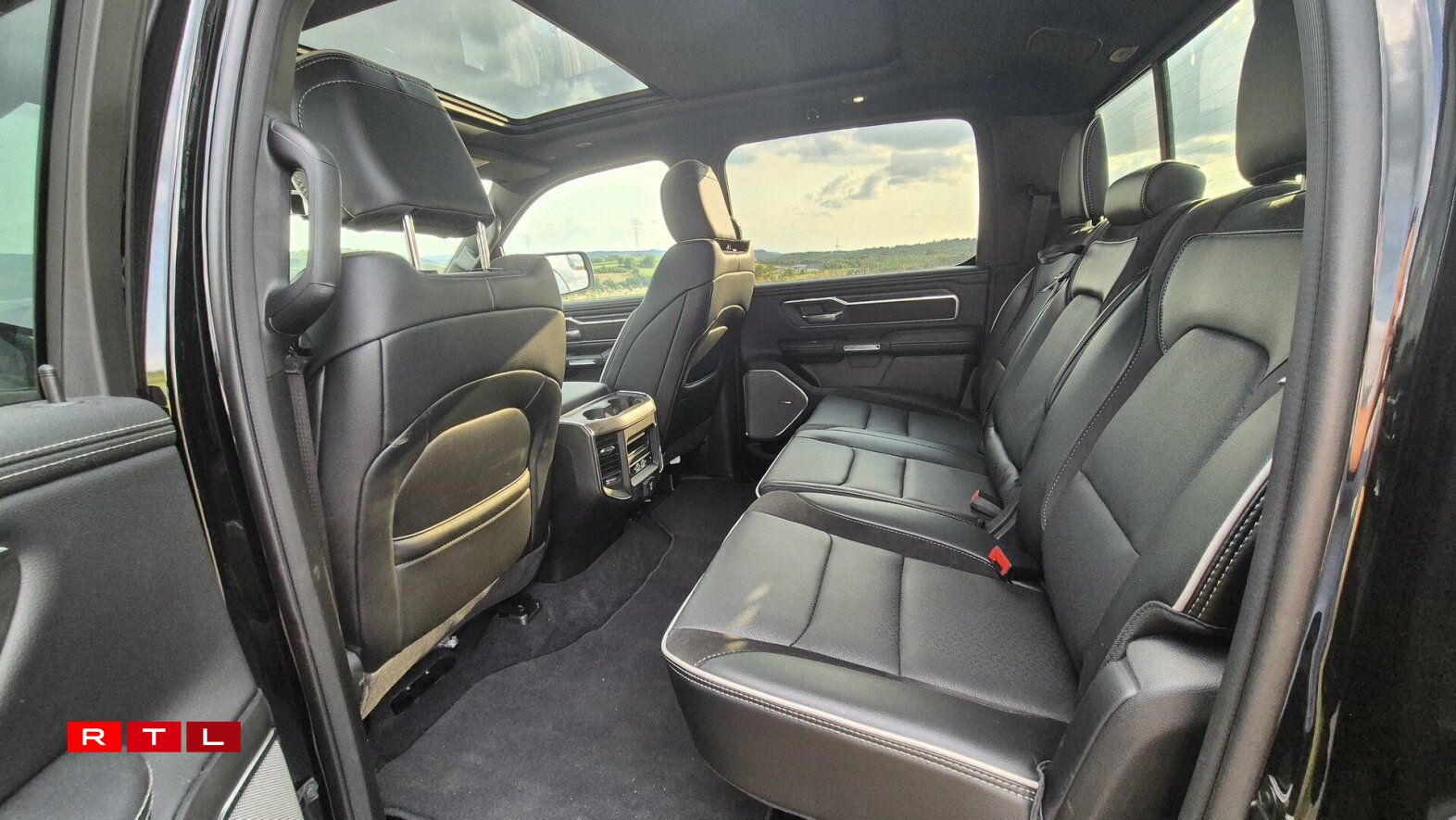 Wann een an der zweeter Sëtzrei keng Passagéier sëtzen huet, kann een do d’Réckbänk ëmleeën, an dann huet een tatsächlech richteg vill Plaz do. Sollt ee plange mat sou engem Pick-up mat der Famill an d’Vakanz ze fueren, dann onbedéngt beim Kaf vum RAM 1500 drun denken, entweder en Hardtop fir d’Luedfläch matzebestellen, respektiv soss ee System mat enger Ofdeckung, fir dass een do och zum Beispill Wallissen asw ënnerbrénge kann, ouni dass se un der fräier Loft transportéiert ginn, wou iwwregens och jidderee sech kéint zerwéieren, wann een enzwousch geparkt huet.