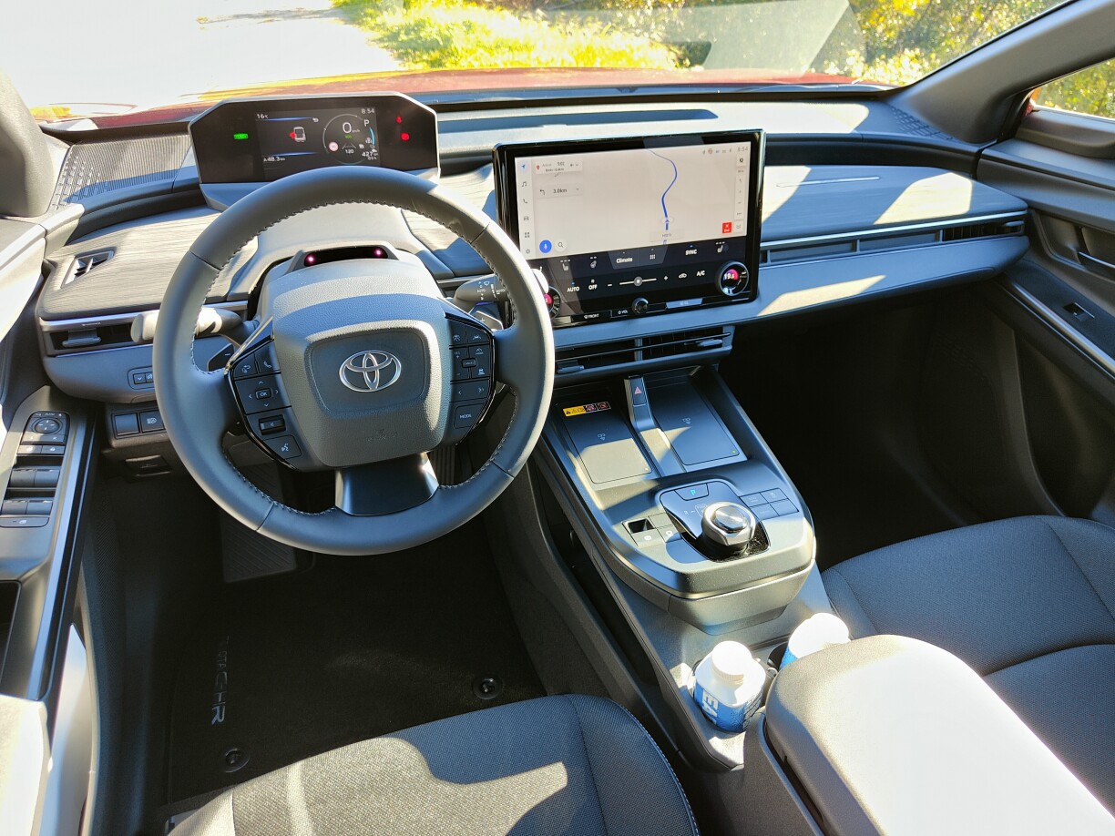 Toyota huet iergendwéi nach ëmmer Bensinn am Blutt, och bei sengen Elektromodeller. Well och ouni Verbrenner steet d’Freed um Fuere ganz vir op der Prioritéitelëscht. An am C-HR+ hu se dat fäerdegbruecht. E fiert knackeg, fiedert net ze straff, läit an de Kéiere genee richteg a gëtt gutt Réckmeldung. Ganz staark u Peugeot erënnert dat klengt an handlecht Steierrad, allerdéngs plot den C-HR dee selwechte Problem: d’Steier ass déif an den Display fir de Chauffer héich placéiert – jee no Gabarit gëtt do en Deel vun der Rénkel verstoppt.