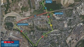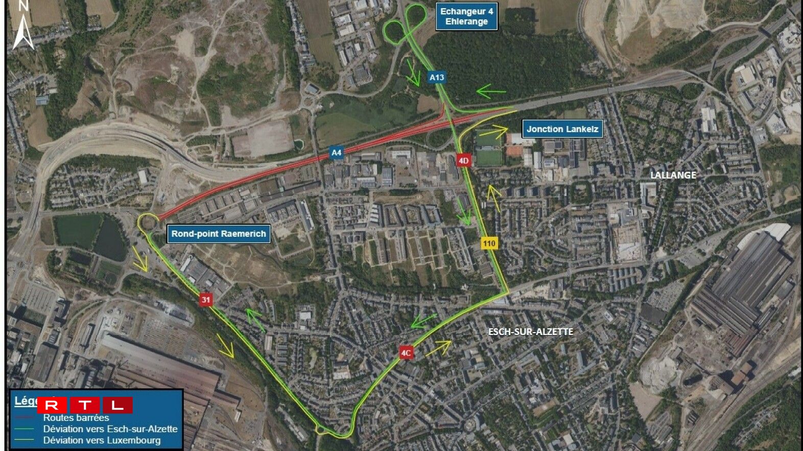 Le trafic en provenance de l’autoroute A13 et en direction de l’autoroute A4 vers Esch-sur-Alzette sera dévié à partir de la jonction Lankelz via la N4D, le CR110, la N4C et la N31.