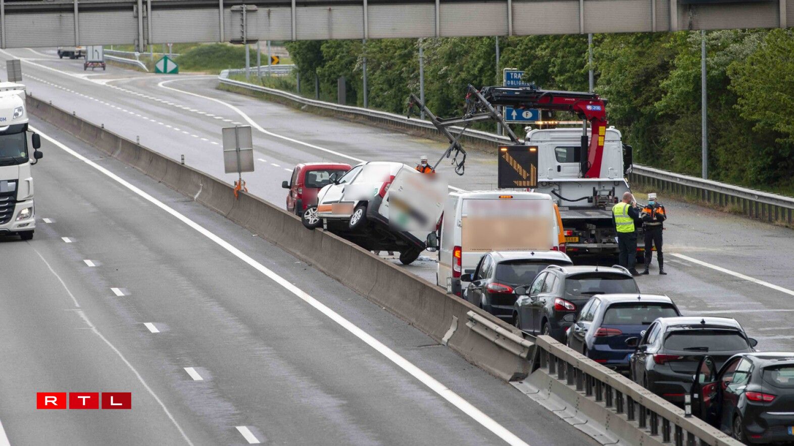 E Chauffeur vun engem Liwwerwon huet dëse Stau spéider net bemierkt an ass dunn engem Auto hannendrop gerannt. De Liwwerwon huet sech dowéinst iwwerschloen an ass op der Säit leie bliwwen.