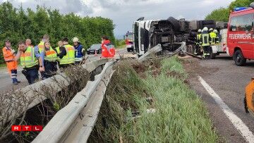 Op der däitscher A64 a Richtung Grand-Duché huet e Camionschauffer d’Kontroll iwwert säi Gefier verluer. De Camion gouf widder déi mëttelst Leitplank geschleidert an ass doropshin ëmgekippt.