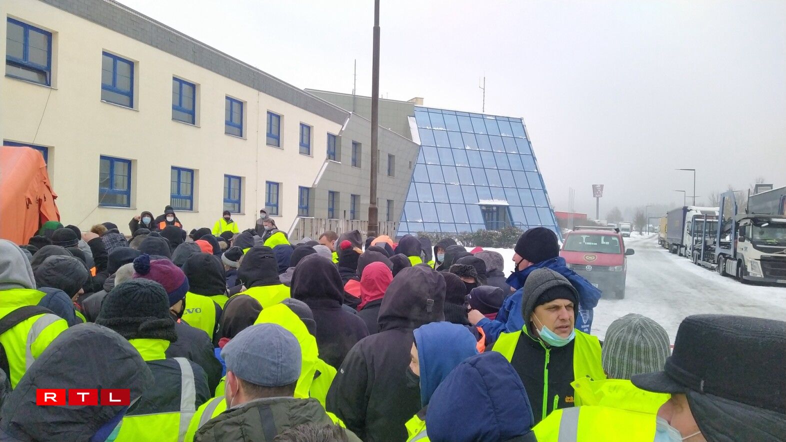 Kilometerlaang Stauen un der Grenz tëscht Däitschland an Tschechien, Camionschaufferen, déi stonnelaang virun improviséierten Testzenteren stinn ...