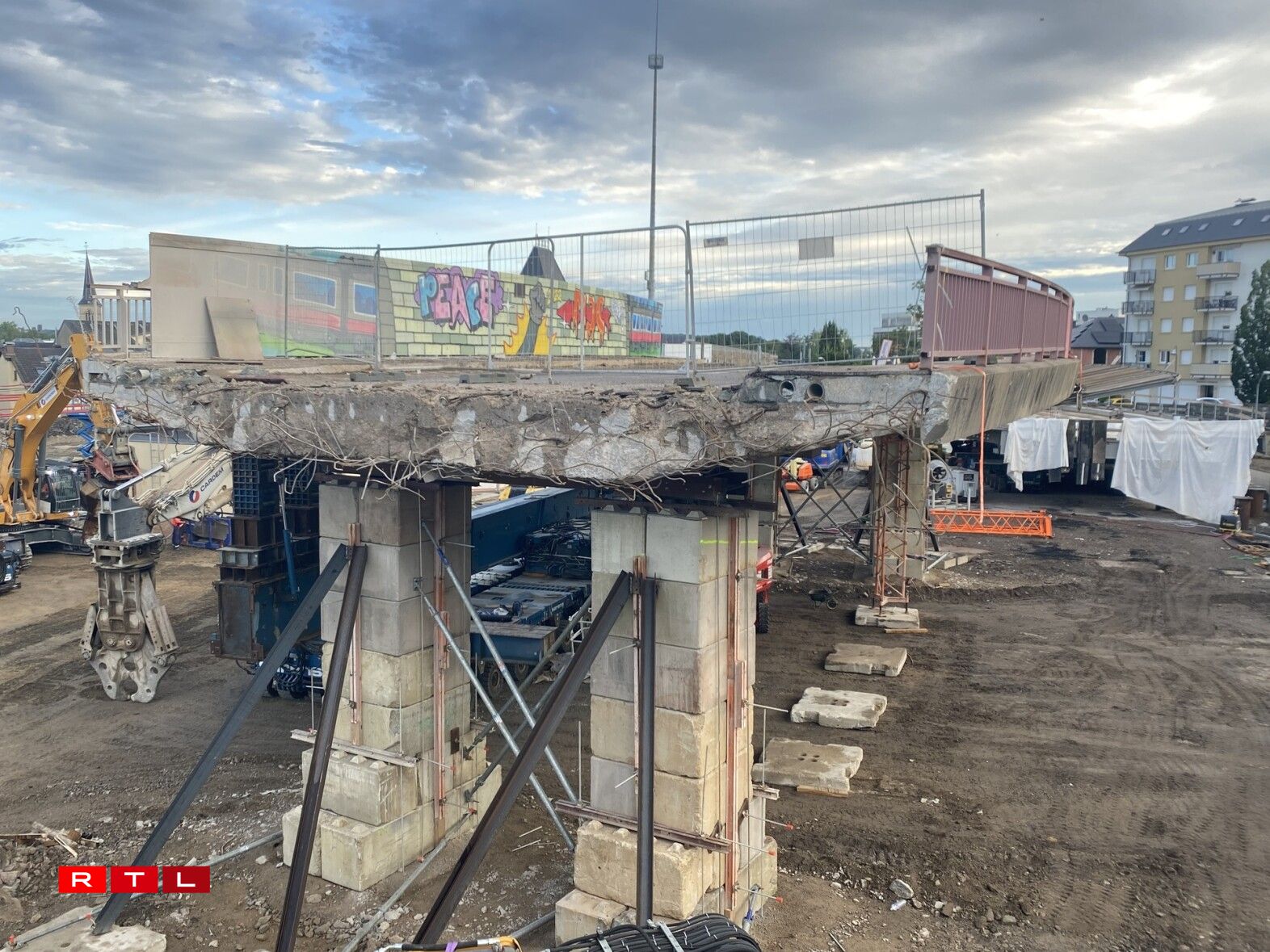 E Samschdeg den Owend goufen déi lescht 600 Tonnen vun der Bréck mat enger schwéierer Maschinn deplacéiert.