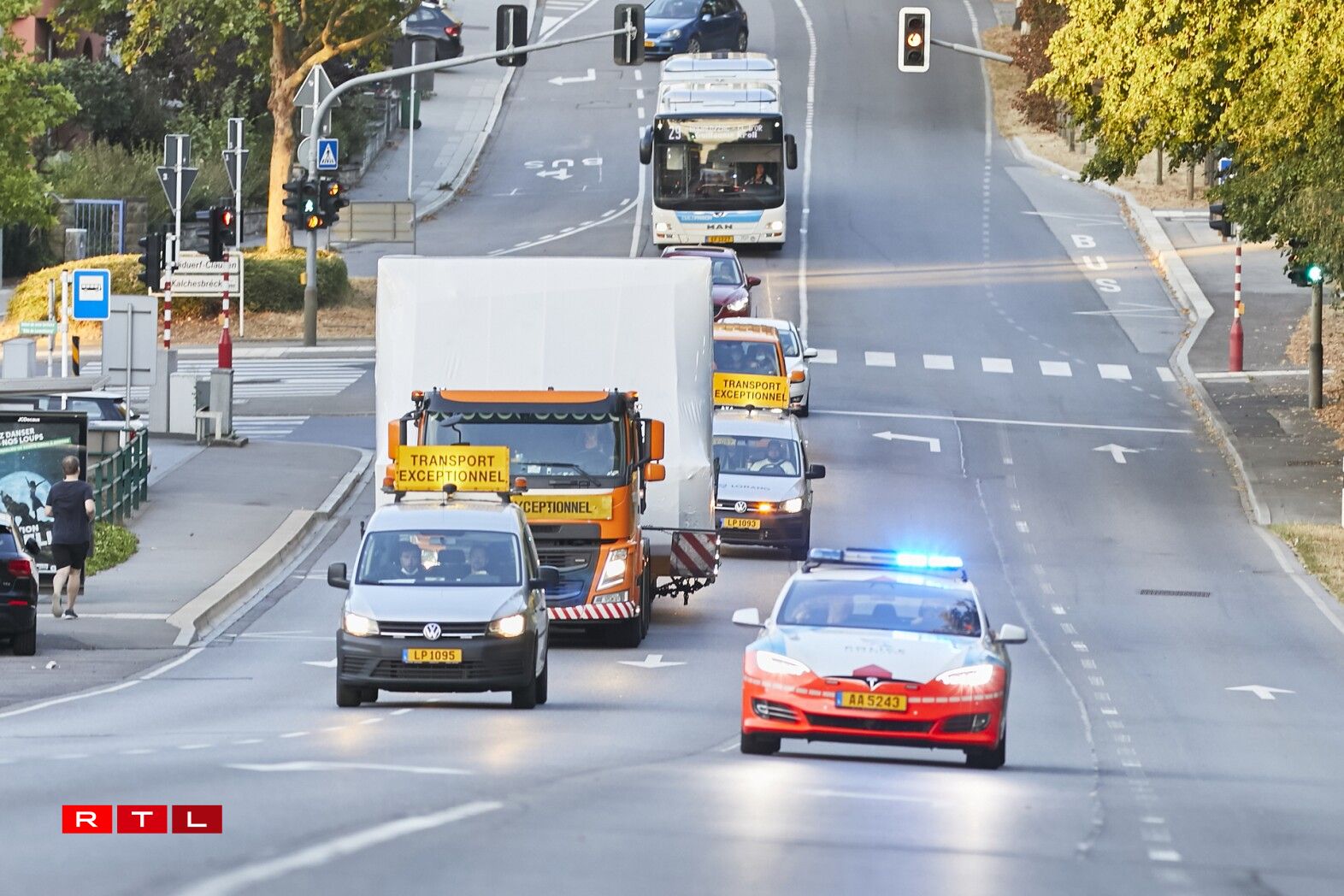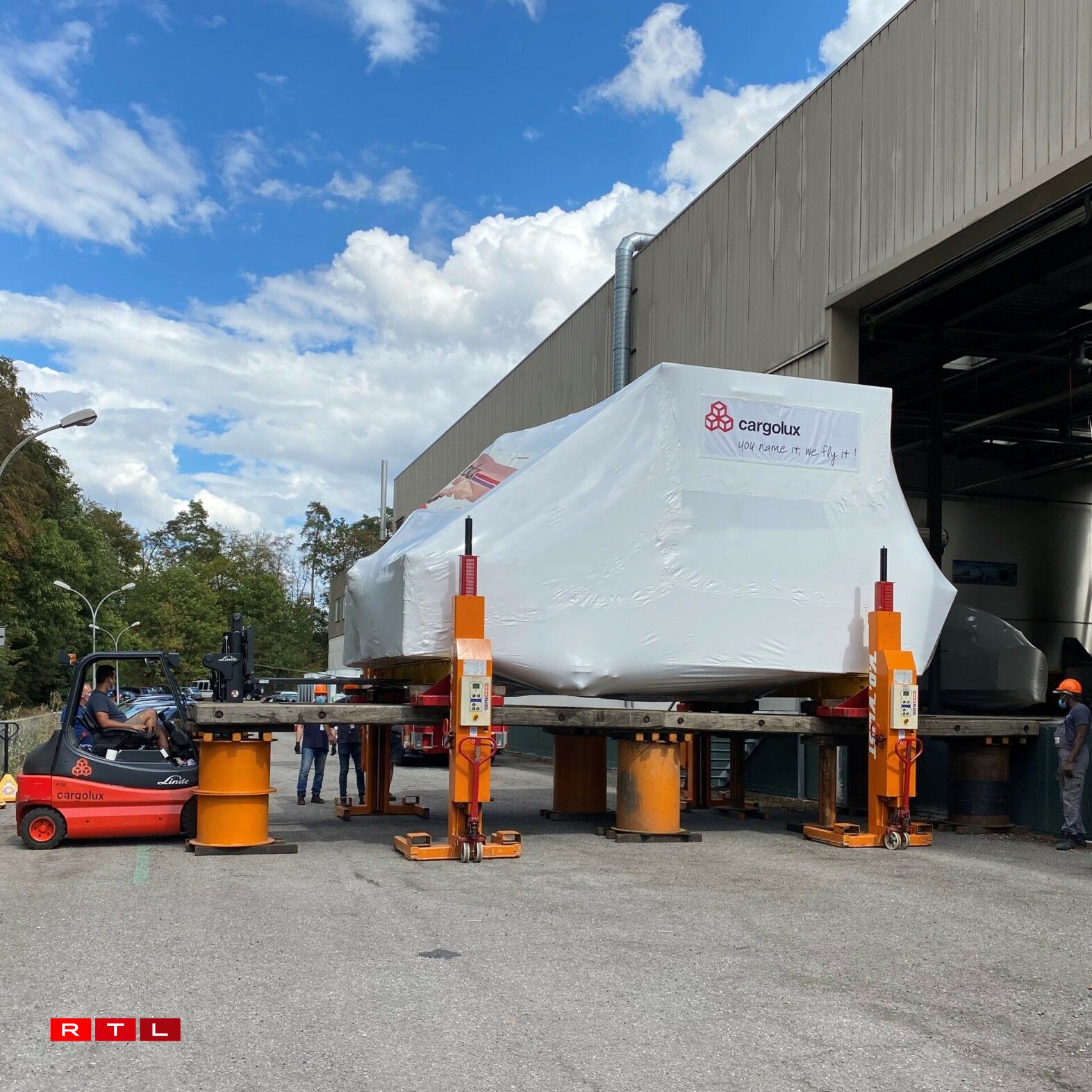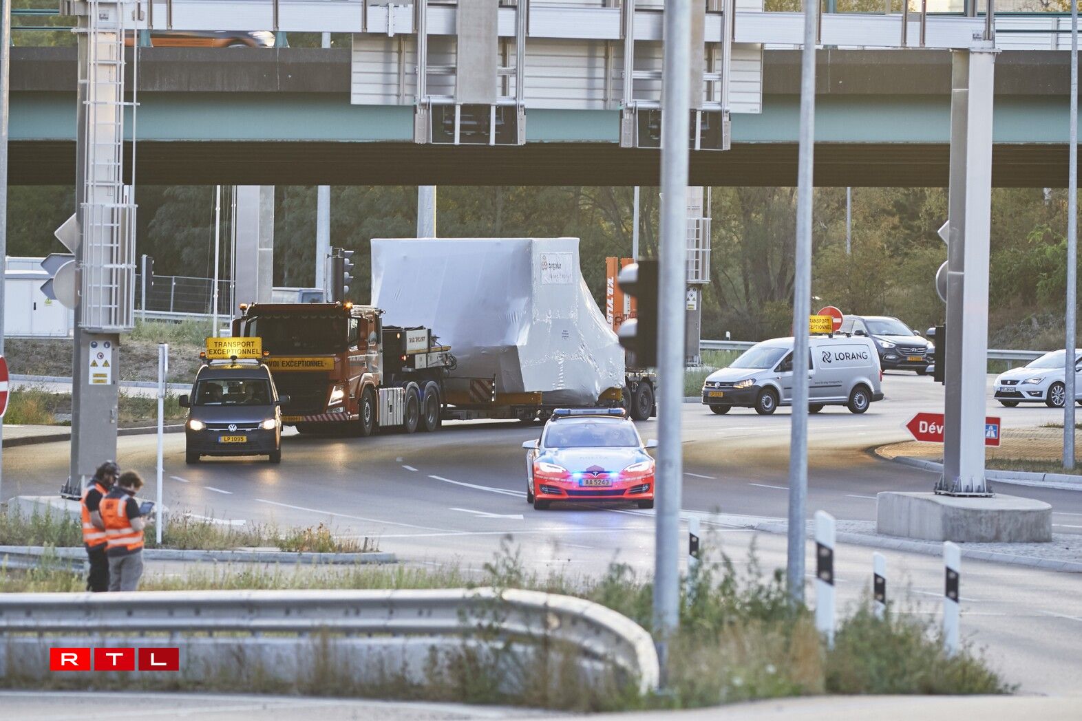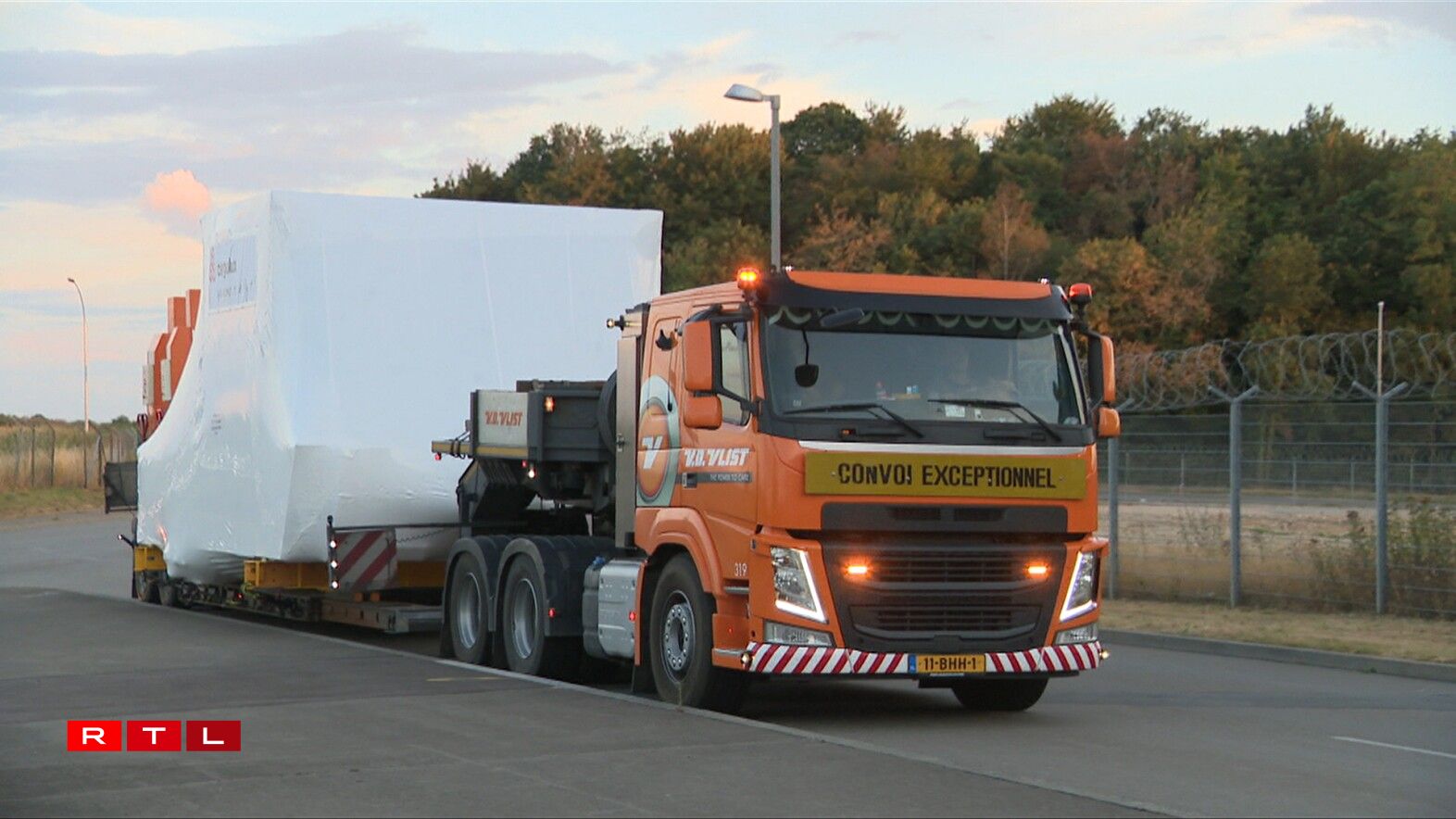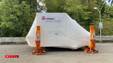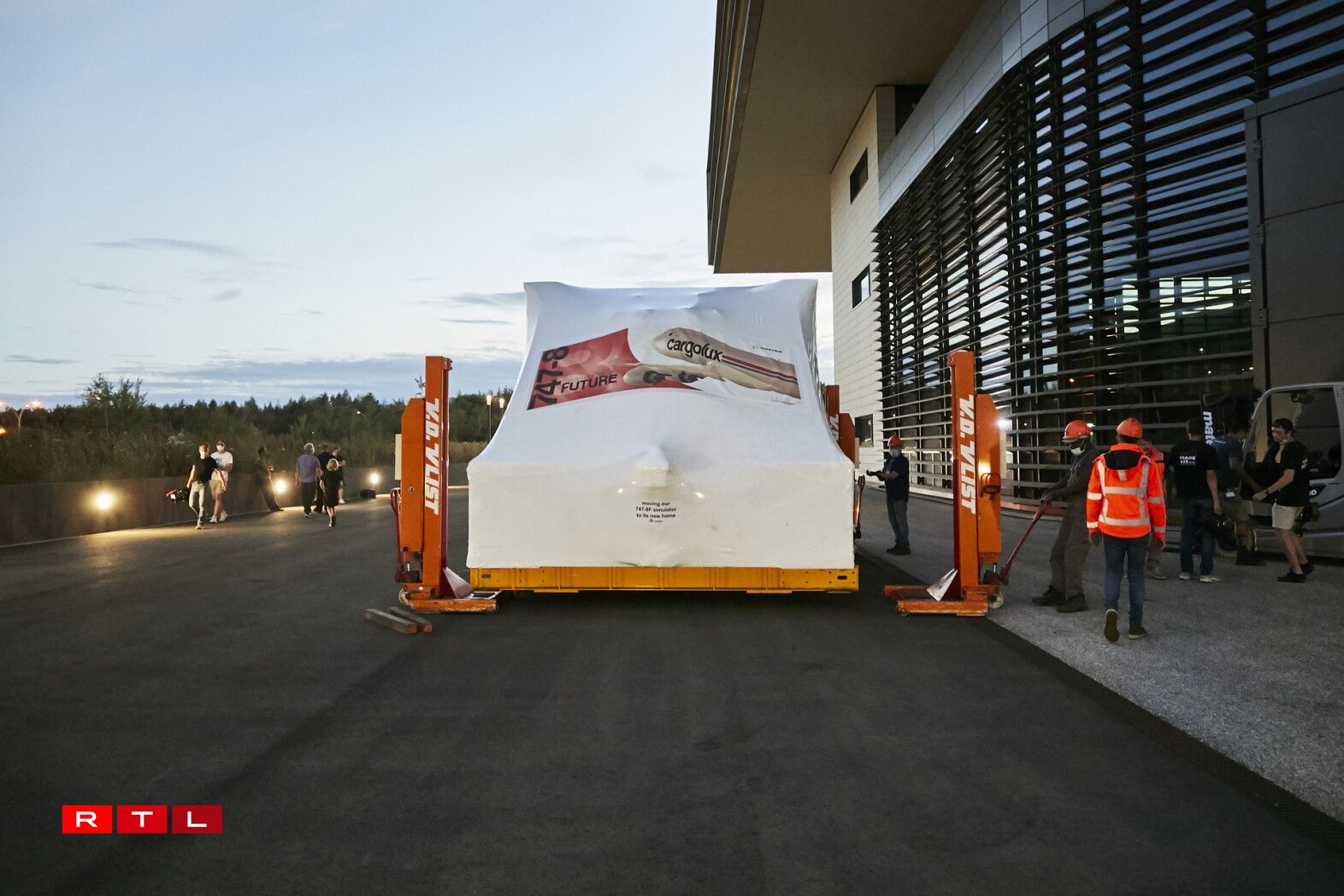 Et handelt sech dobäi ëm e Simulator vum Jumbo-Jet Typ 747-8F aus dem Joer 2012. Wéinst dem schwéiere Gewiicht vu ronn 10 Tonnen an der Breet vum Simulator misst den Transport mat Hëllef vun engem Convoi exceptionnel an a Begleedung mat der Police duerchgefouert ginn.