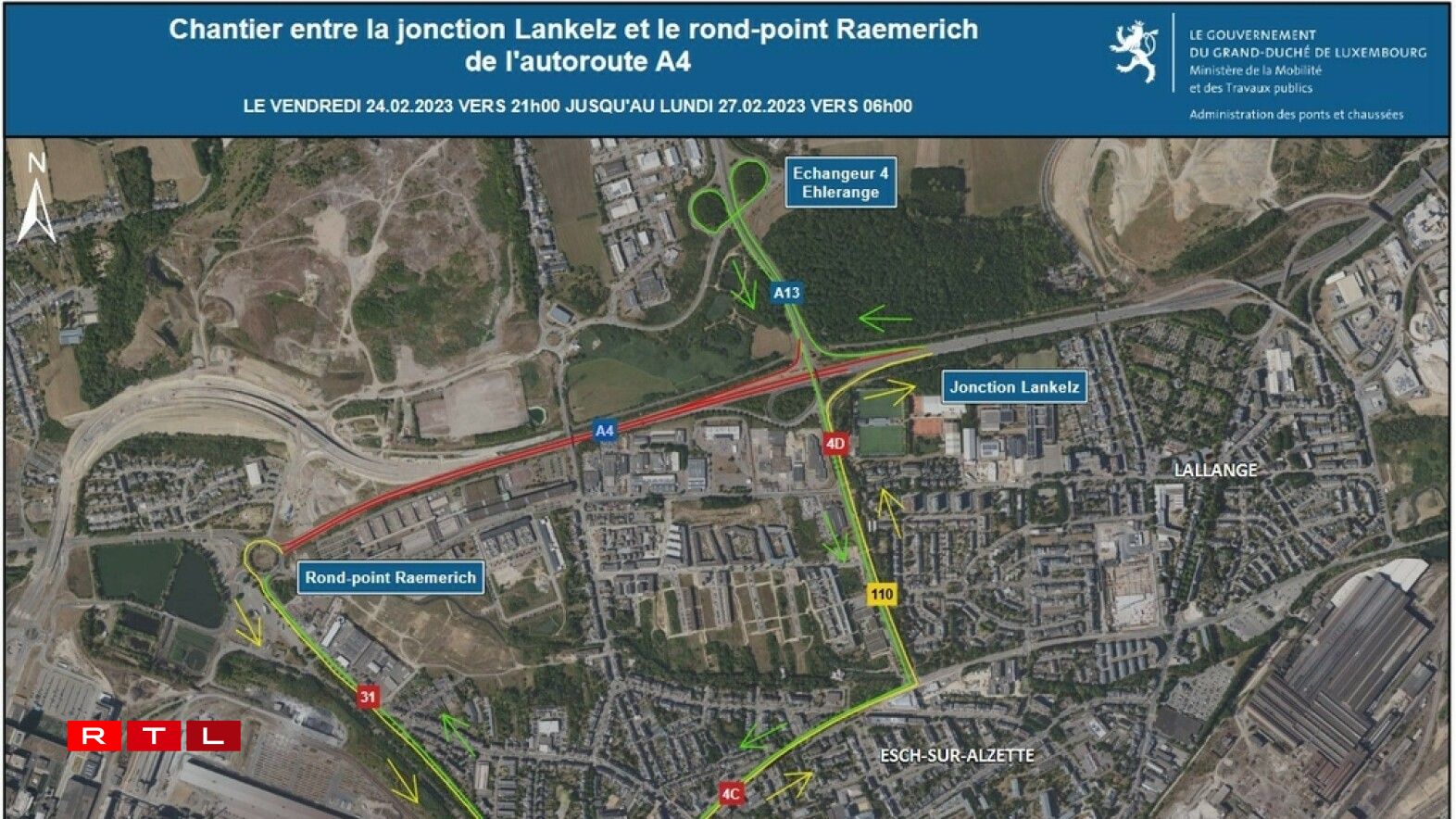 Fir den Tronçon vun der A4 gëllt déi komplett Spärung och just de Weekend, wéi den Direkter vum Service fir kommunal Aarbechte Lucien Malano erkläert. “Ponts et Chaussées mécht do den Amenagement fir d’Preparatioune fir d’Liaison Micheville. Vun e Méinden un wäert den Trafic op deem Tronçon och erëm an 2 Richtunge lafen.”