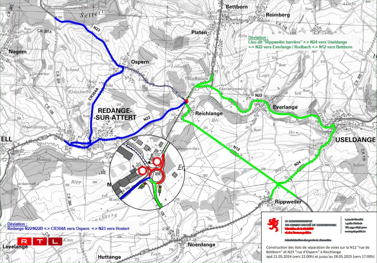 Méi genee gëtt en neie Rond-point zu Räichel gebaut, bei deem d’Nationalstroossen N12/N22 an N23 zesummelafen. Wéinst deem Chantier ginn d’Rue de Bettborn (N12) an d’Rue d’Ospern (N23) vun e Mëttwoch dem 21. Mee um 22 Auer bis e Mëttwoch den 28. Mee um 17 Auer gespaart.