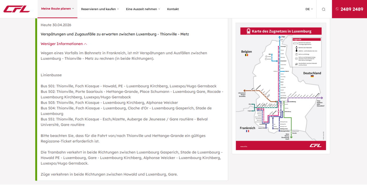 Wéinst engem net preziséierte Virfall um franséische Reseau kënnt et um Donneschdeg op der Zuchstreck Lëtzebuerg - Thionville - Metz, a béid Richtungen, zu Verspéidungen oder Ausfäll.
