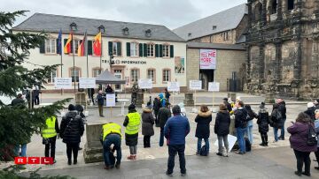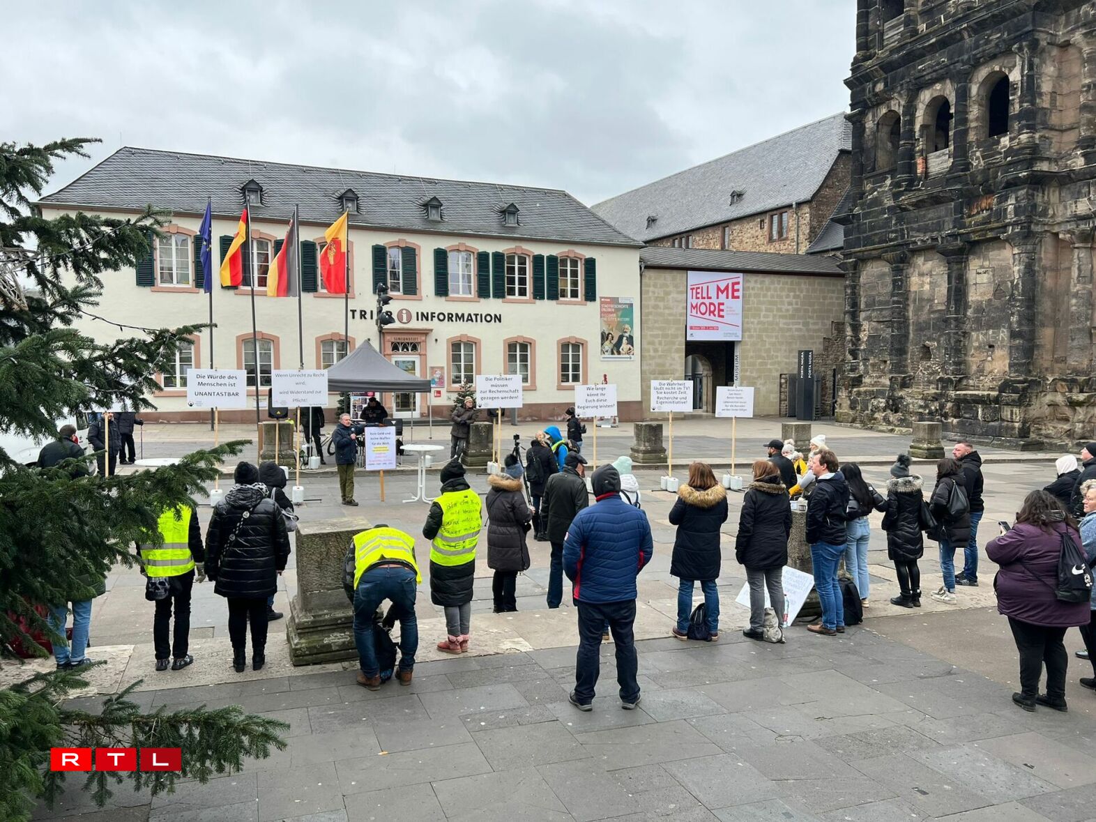 Ongeféier 50 Leit hate sech bei der Porta Nigra versammelt an ënnert anerem géint déi Gréng a géint Waffeliwwerungen a Krisegebidder demonstréiert.