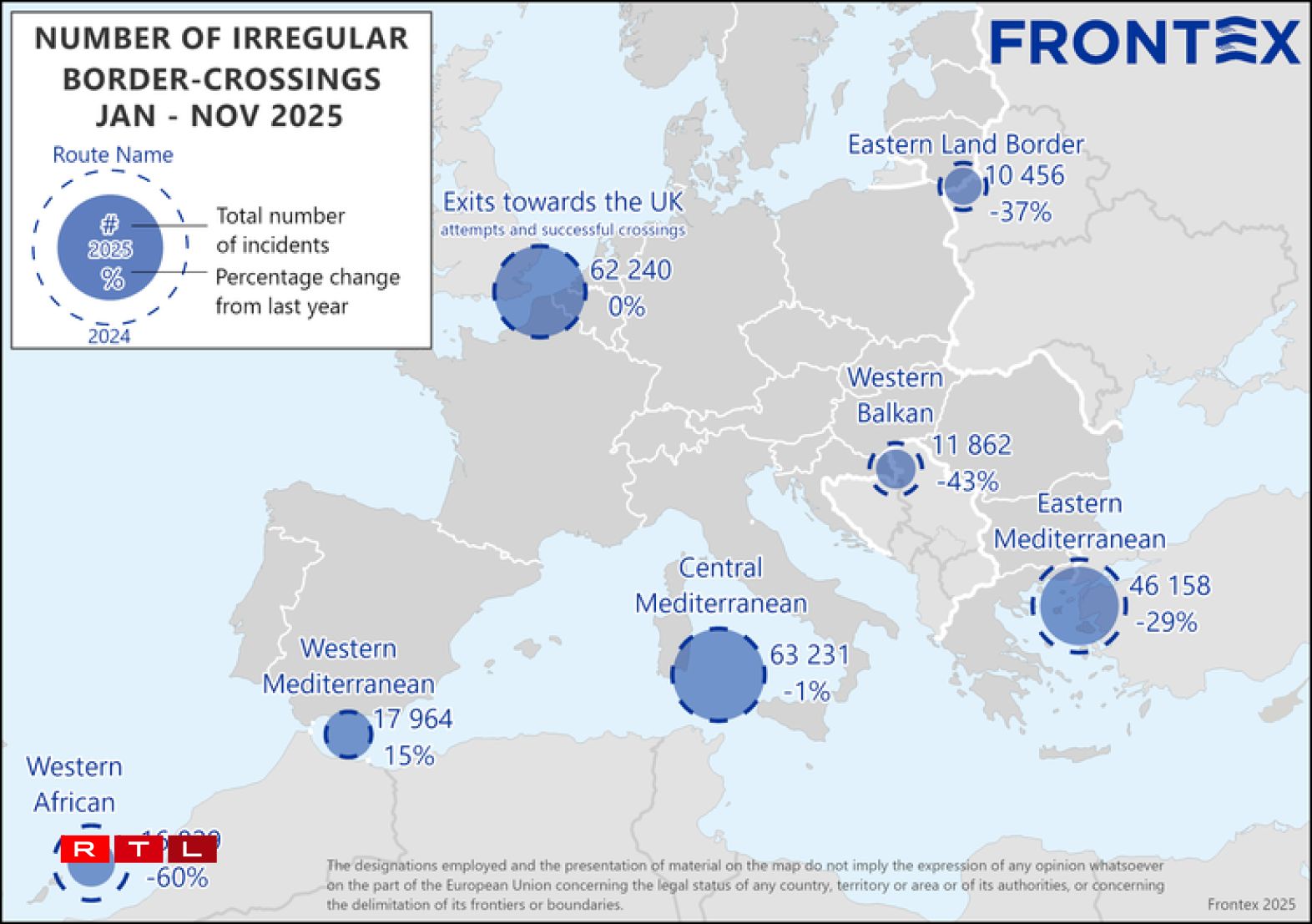 Déi Europäesch Agence ass fir d’Iwwerwaachung vun de Grenzen a Küsten zoustänneg. Besonnesch iwwer Westafrika koume mat manner wéi 17.000 Mënschen dëst Joer ronn 60 Prozent manner Leit an d’EU. Och iwwert de Balkan sinn iwwer 40 Prozent manner Persoune komm.