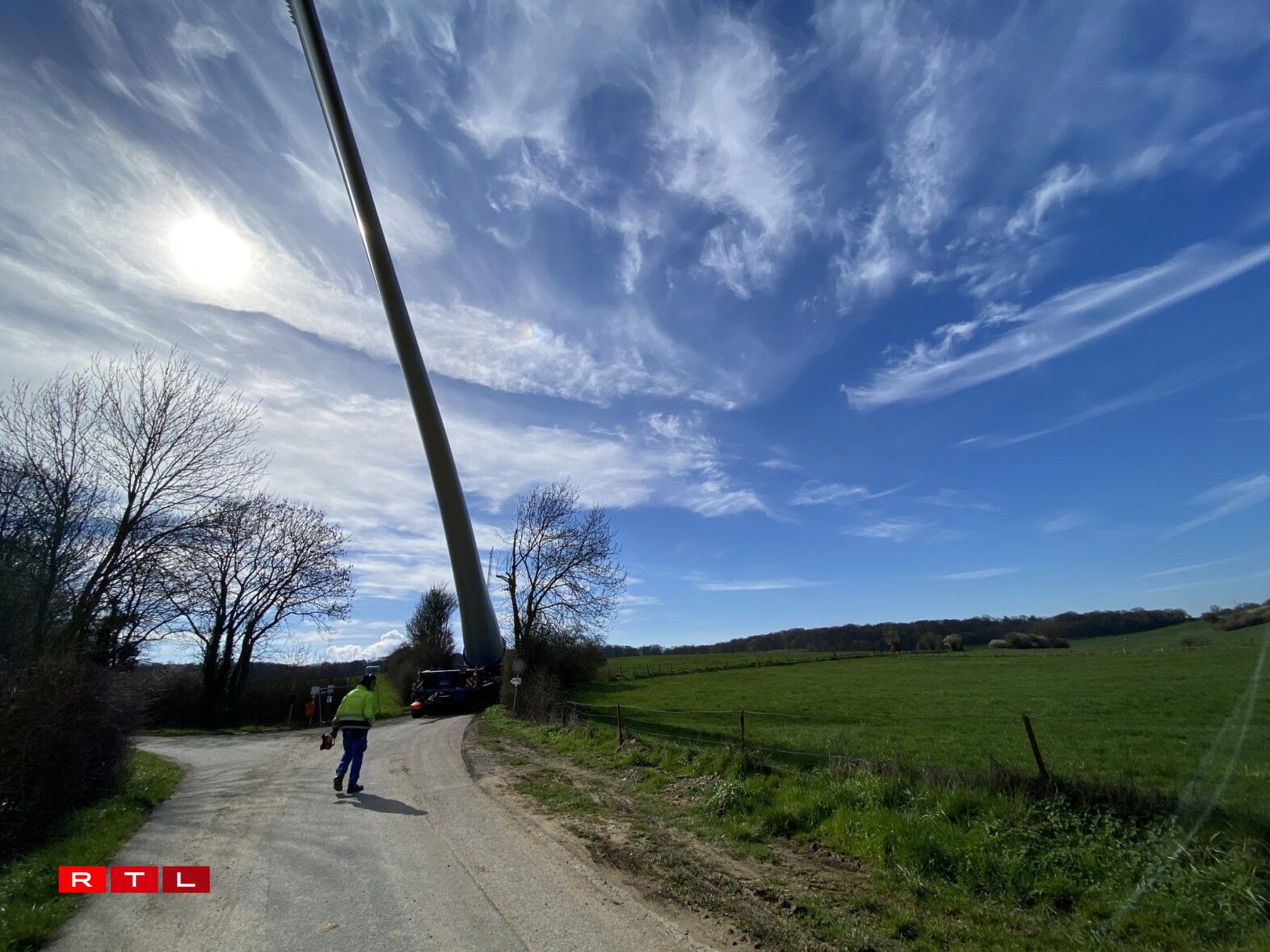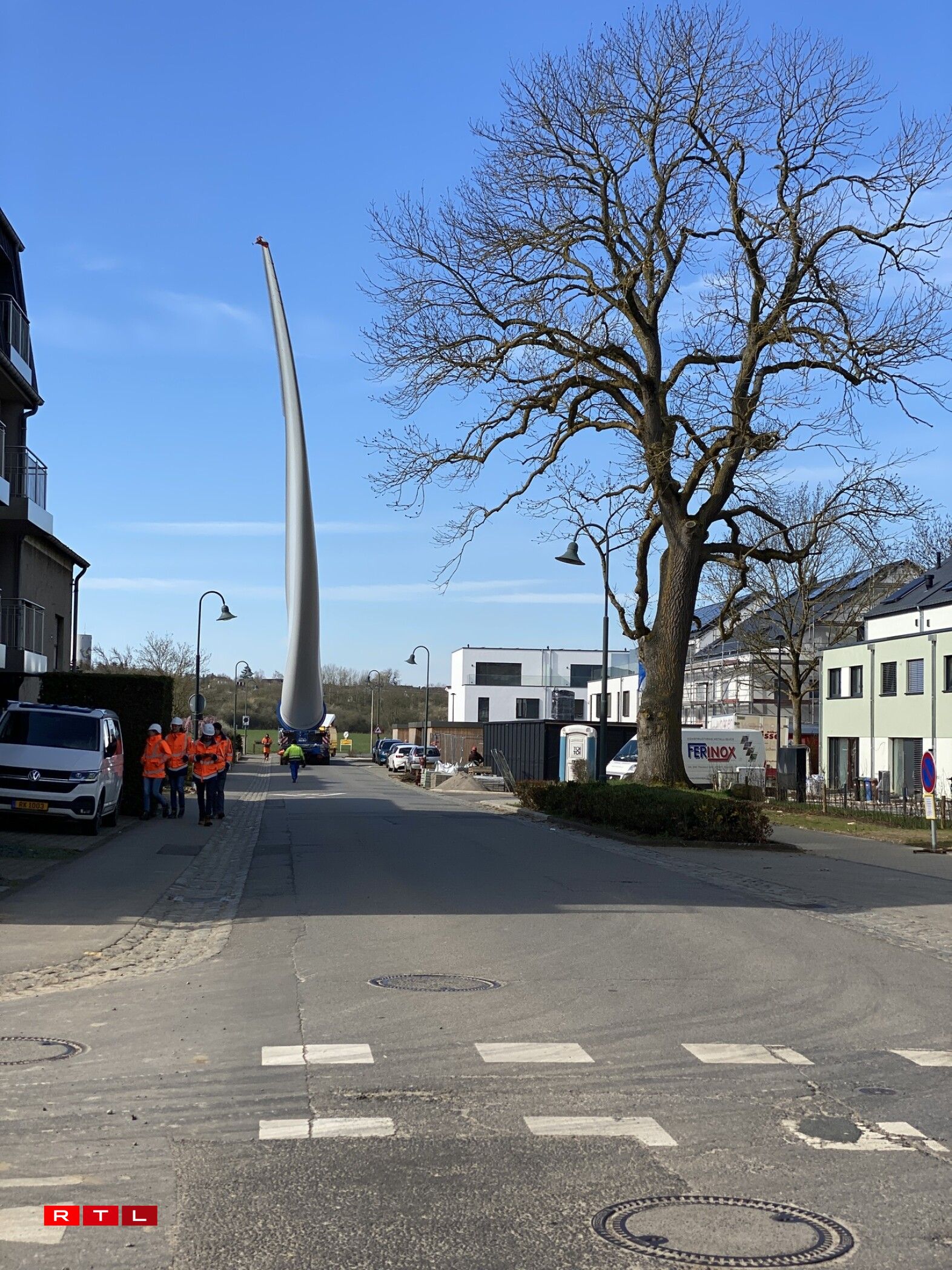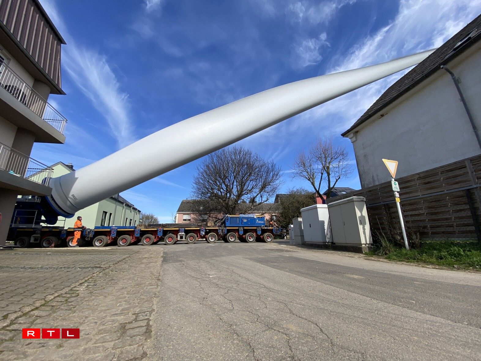 Um Dënschdeg goufe riseg Rotorblieder deels héichkant duerch d’Stroosse manövréiert, guer net einfach bei enger Längt vun ëm déi 60 Meter an engem Gewiicht vu 25 Tonnen pro Blat. Déi gehéieren zu enger Wandmillen, déi an de Felder hannert dem Duerf opgeriicht gëtt a schonn am Juni soll a Betrib goen. Da soll se eng 1.500 Stéit mat Stroum versuergen.