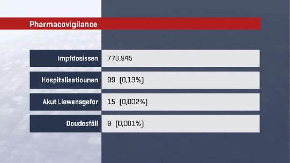 Mëttlerweil goufen zu Lëtzebuerg 773.945 Dosisse versprëtzt (Stand 6. September 2021). Am aktuelle Rapport vun der Pharmacovigilance ginn 1.864 Fäll gemellt vu Niewewierkungen no enger Impfung. 99 Persoune goufen no enger Impfung hospitaliséiert. A 15 Fäll waren d' Persounen an akuter Liewensgefor. A 9 Persoune sinn no enger Impfung gestuerwen.