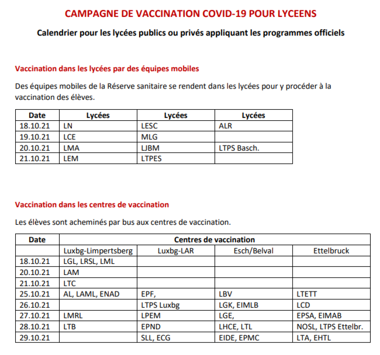 Eng 90% vun den Enseignanten a 55% vun de Schüler iwwer 12 Joer si geimpft, ma et hofft een deen Taux weider an d’Luucht gesat ze kréien.