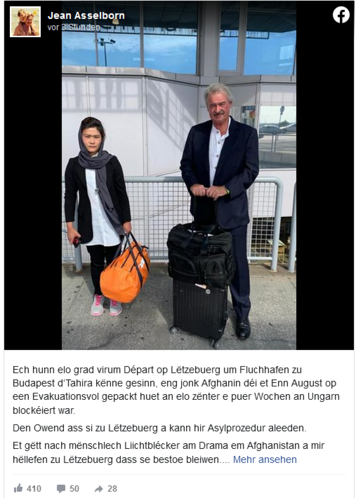 "Et gëtt nach mënschlech Liichtblécker am Drama ëm den Afghanistan a mir hëllefen zu Lëtzebuerg, dass se bestoe bleiwen. Déi schéi Säit am Alldag vun engem, dee fir Asyl zoustänneg ass", schreift den Ausseminister Jean Asselborn zu enger Foto vun deenen zwee.