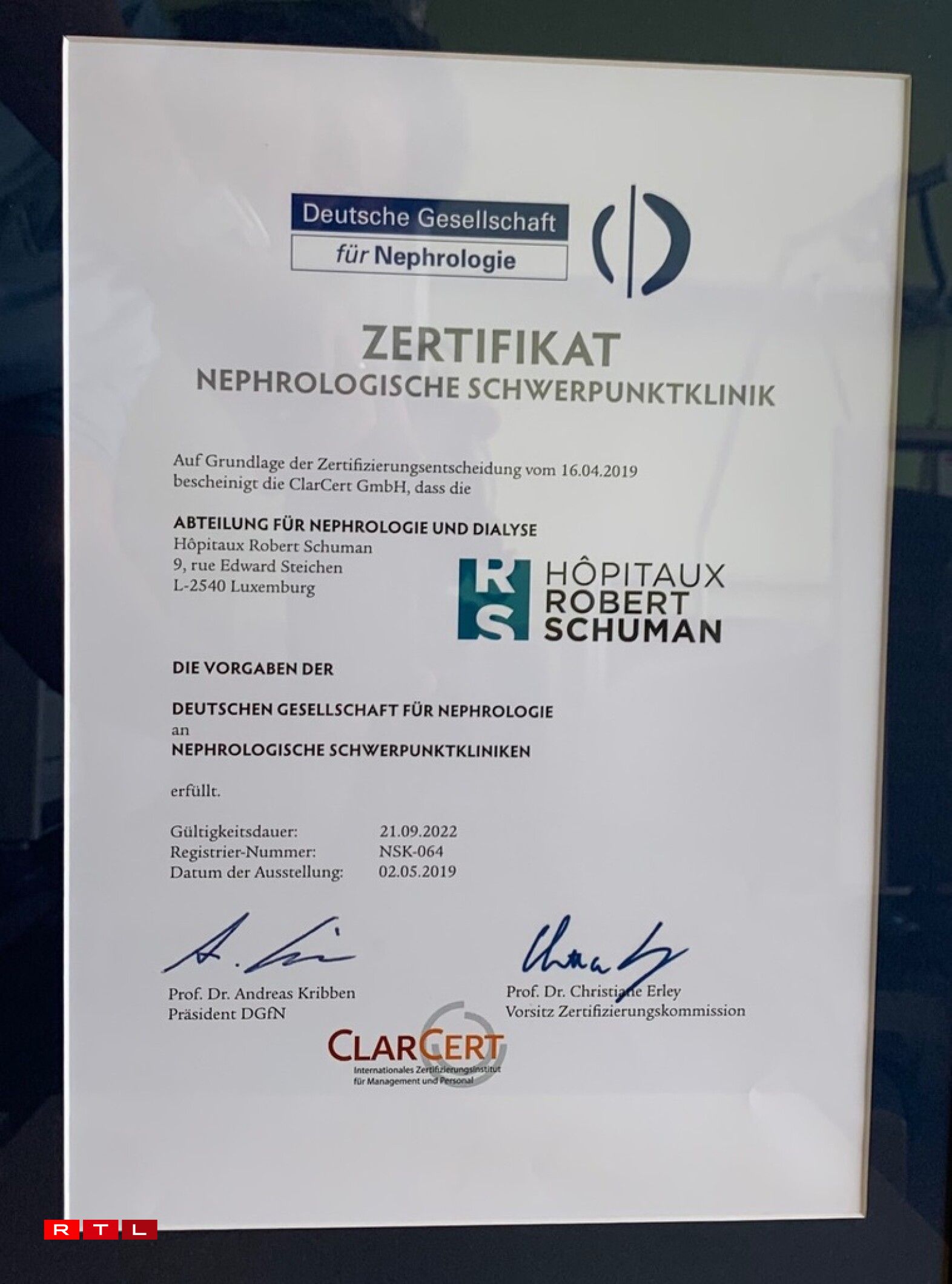 D’Hôpitaux Schumann um Kierchbierg goufen dës Woch ausgezeechent als “Nephrologische Schwerpunktklinik” vun der Däitscher Gesellschaft fir Nephrologie. Nephrologie ass d’Wëssenschaft vun den Nierekrankheeten. Et ass eng éischte Kéier, dass ee Lëtzebuerger Spidol dës Zertifikatioun kritt.