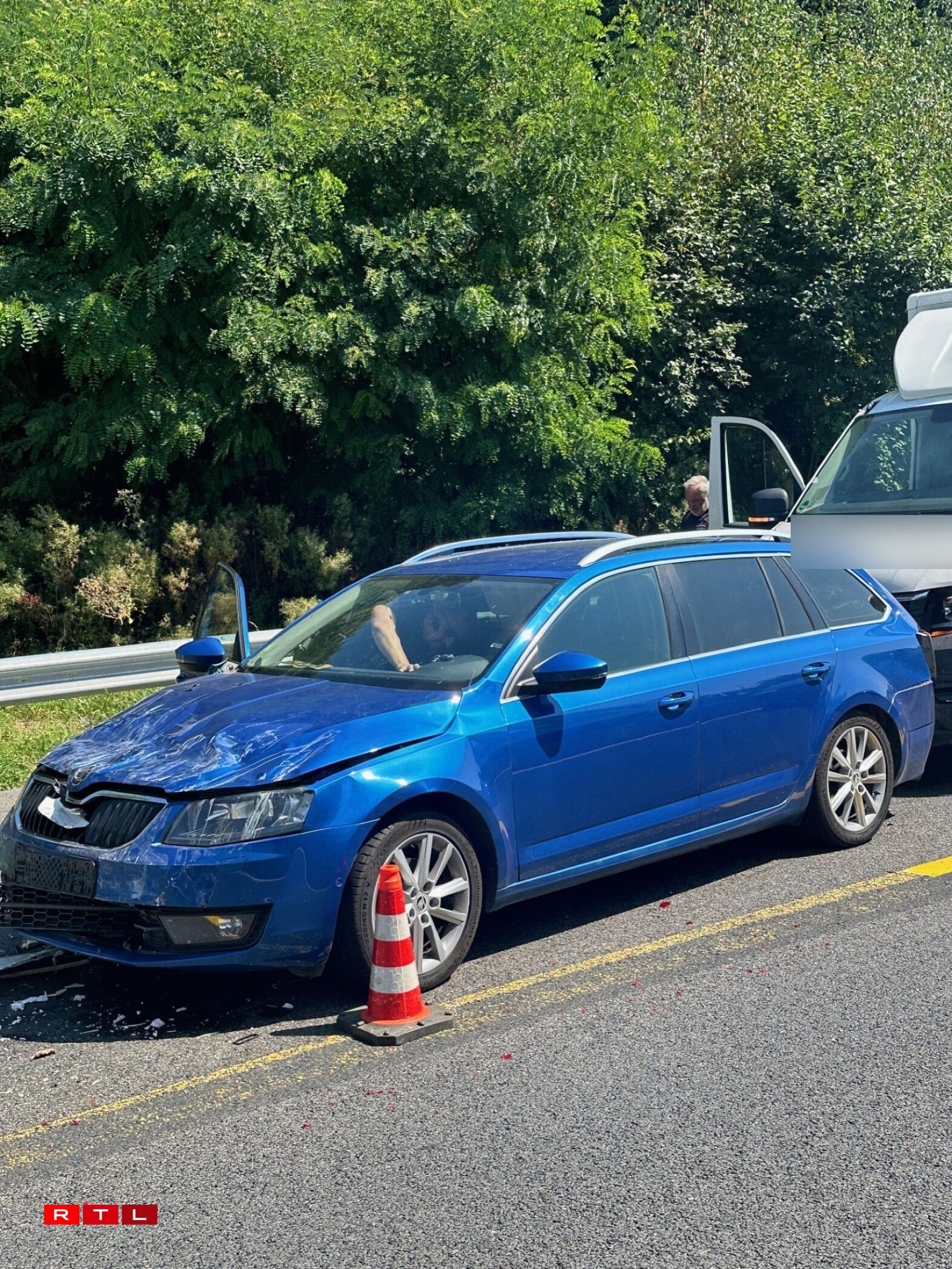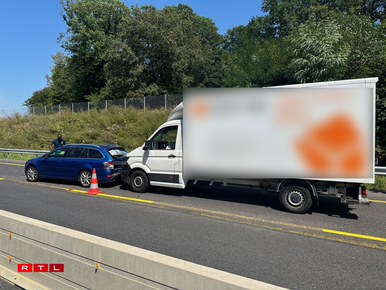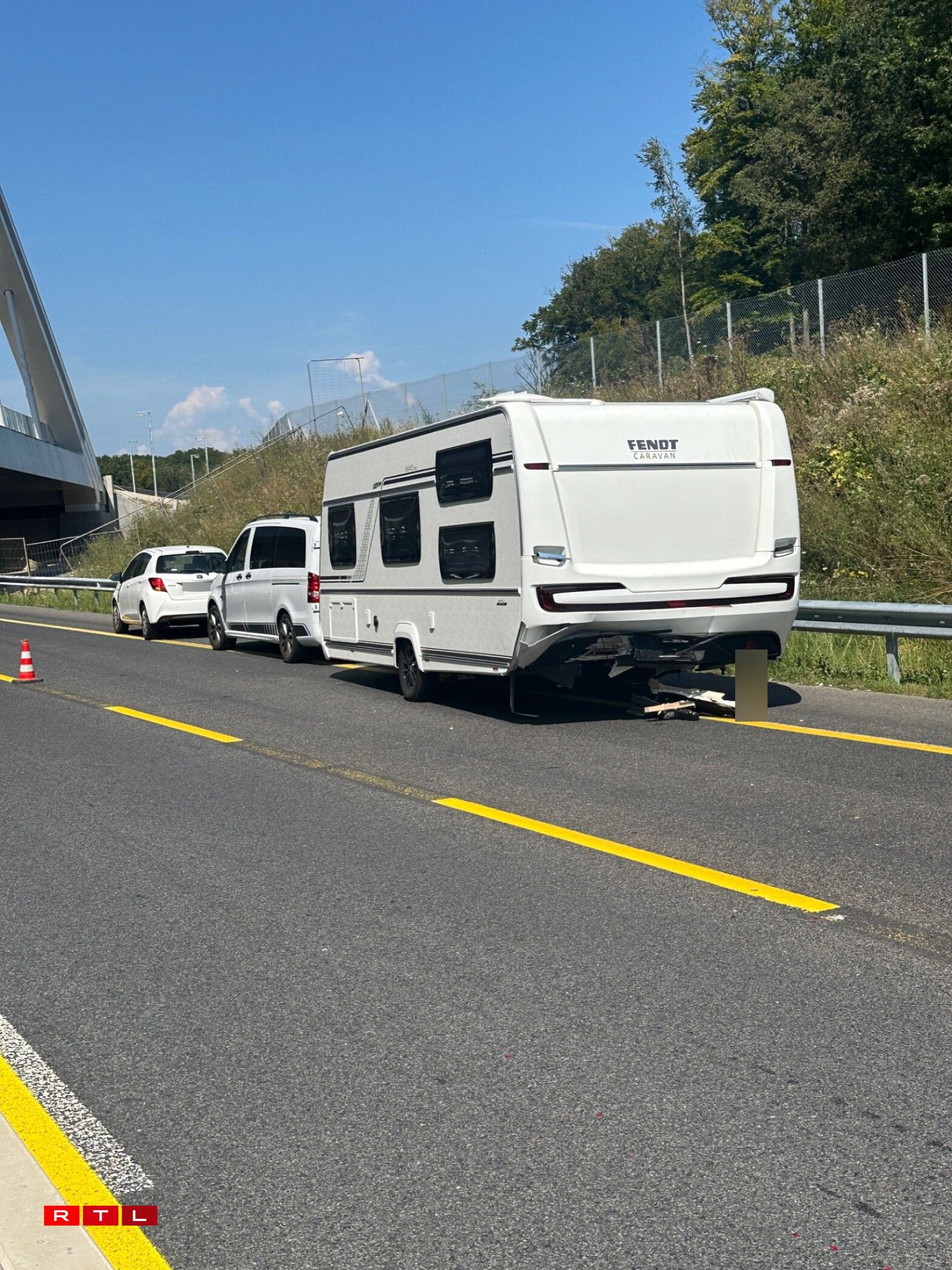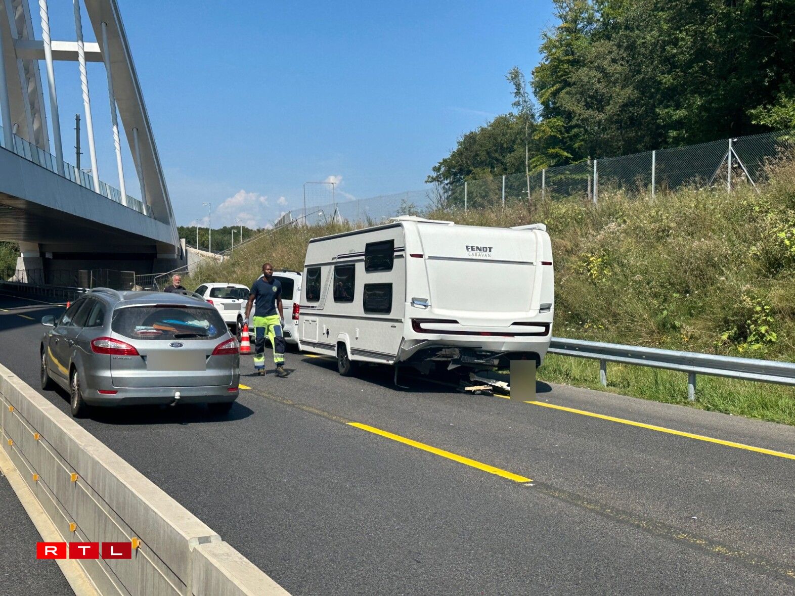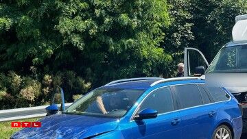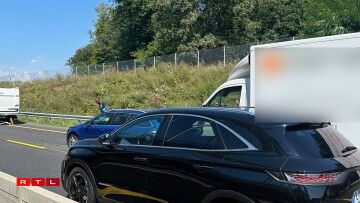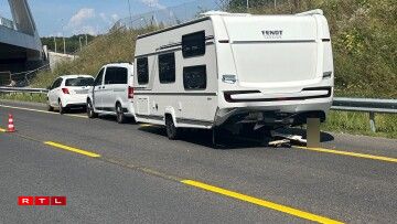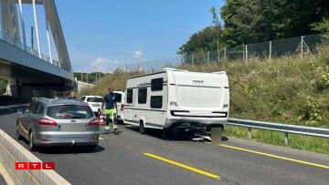 Déi riets Spuer ass den Ament nach blockéiert an et staut sech. Nieft enger Camionnette sinn och eng Roulotte an zwee Autoen involvéiert.
