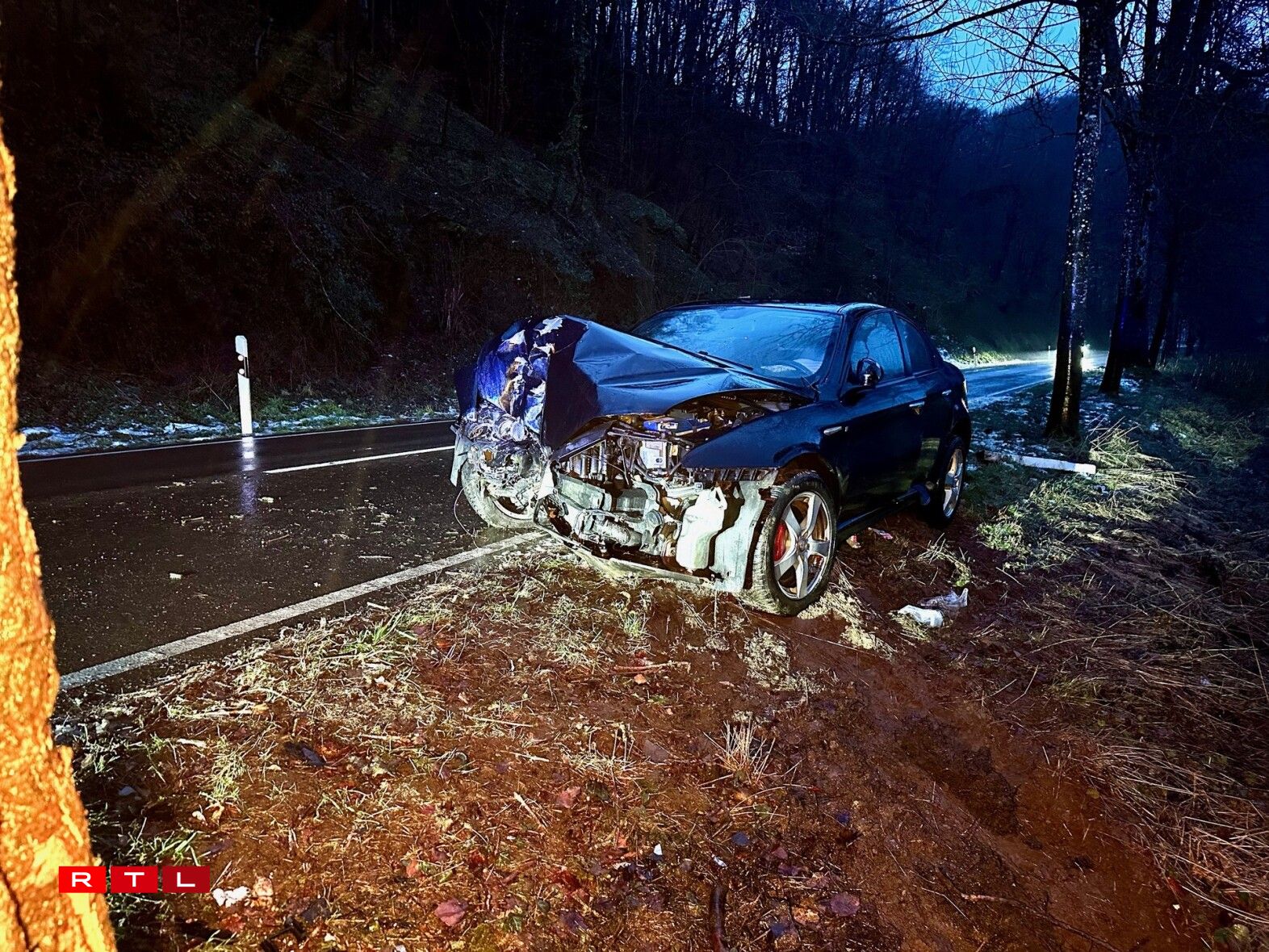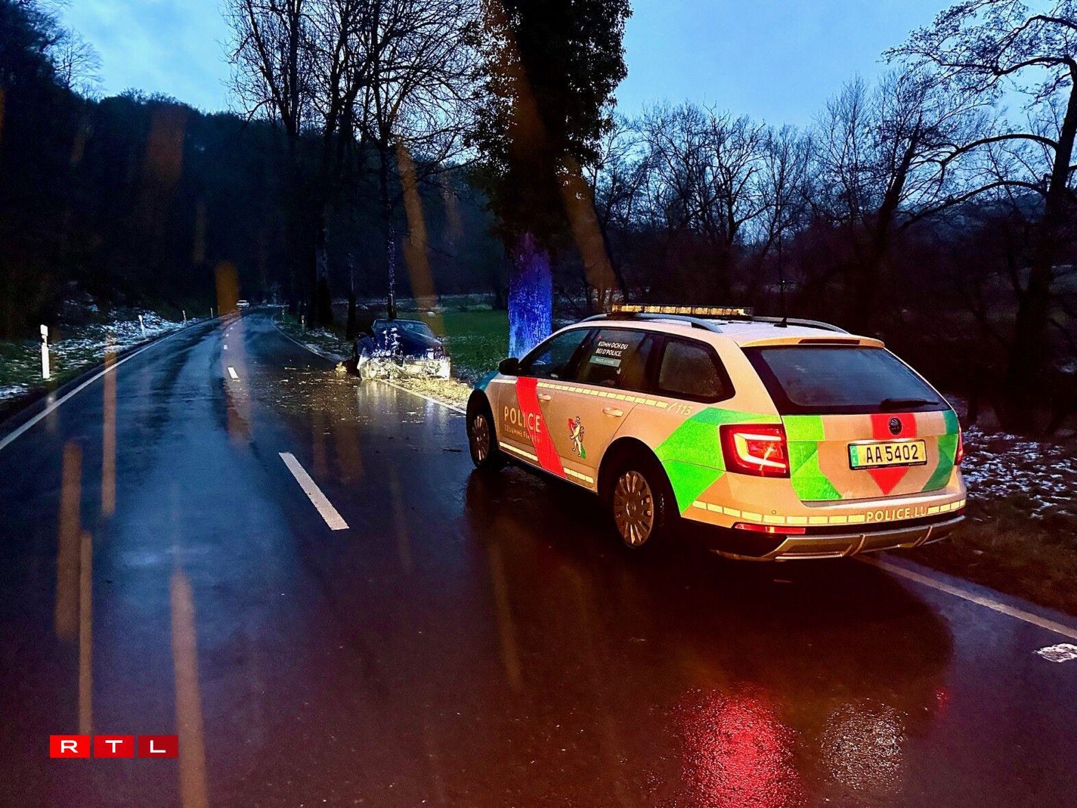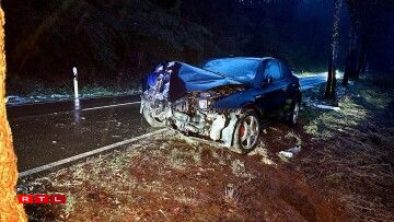 An enger Lénkskéier hat hei en Automobilist d’Kontroll iwwert säi Gefier verluer an ass du frontal an e Bam gerannt. Déi lokal Pompjeeën, grad ewéi de SAMU waren am Asaz.