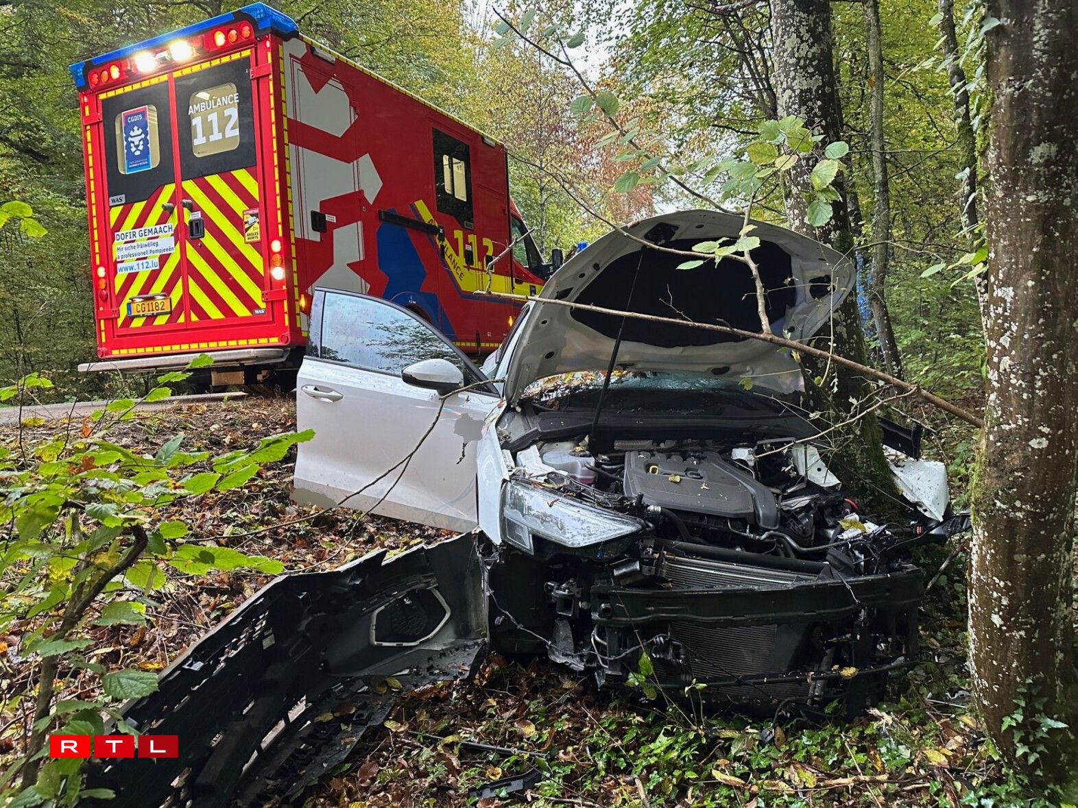 Éischten Informatiounen no gouf de Chauffer beim Accident blesséiert a koum mat der Ambulanz an d’Spidol.