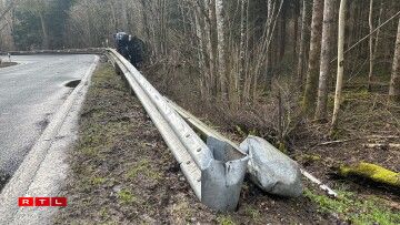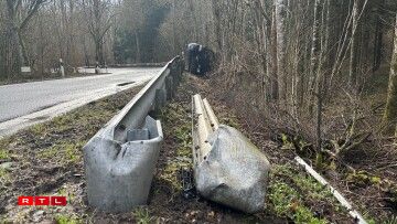 E Chauffer hat an enger Lénkskéier d’Kontroll iwwert säin Auto verluer a war mat dësem iwwer d’Ofspärung geflunn. Hien ass schliisslech mat sengem Gefier nieft de Beem un d’Stoe komm. De Mann koum fir eng Kontroll an d’Spidol.