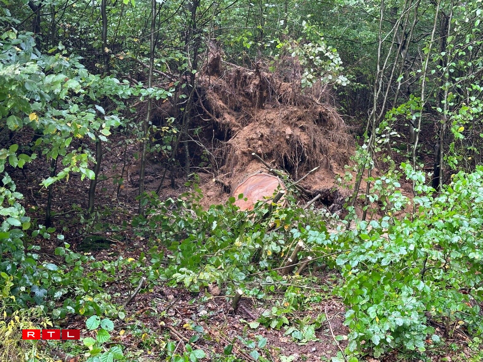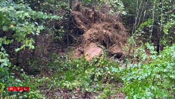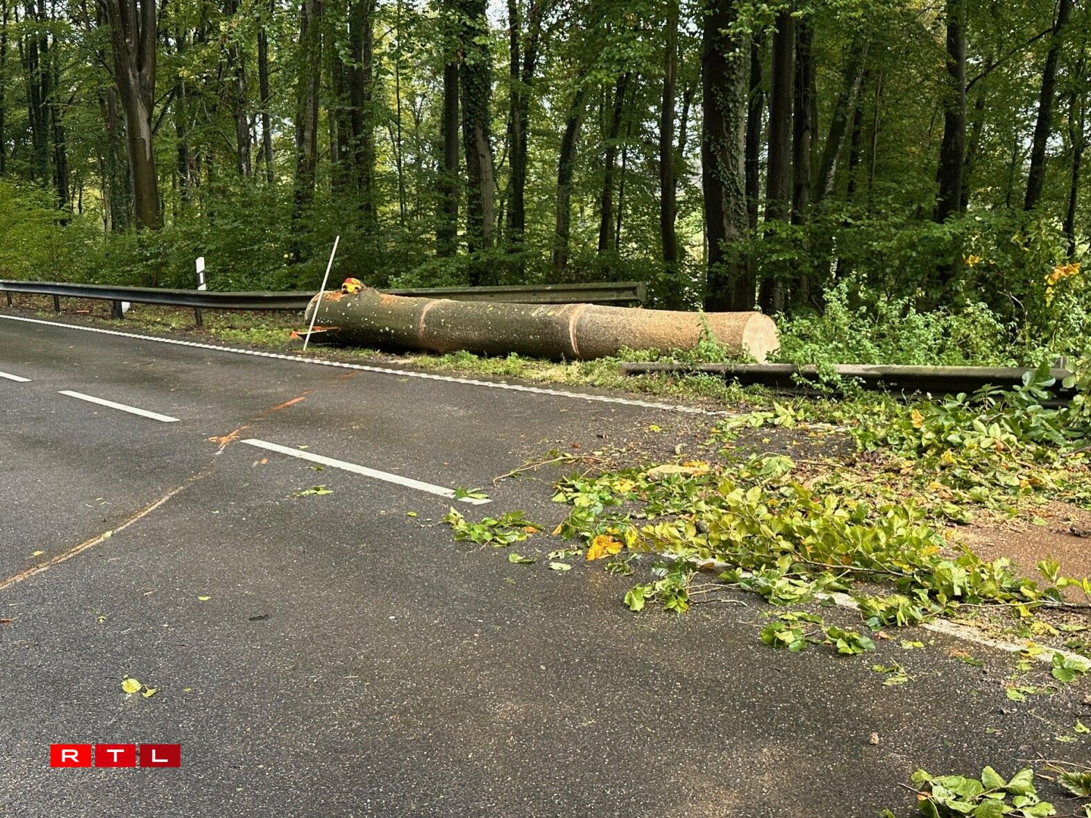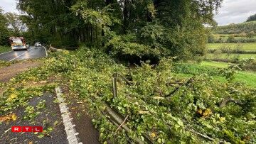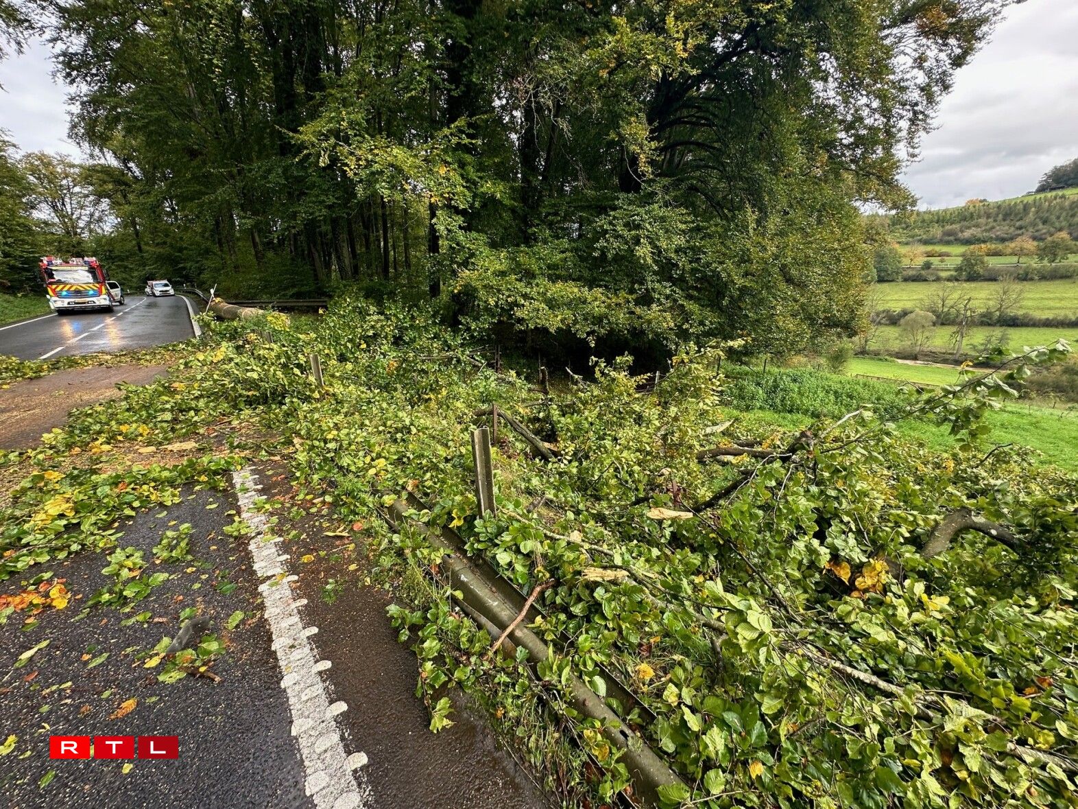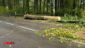 E risege Bam ass ëmgefall, op den Auto, dee grad gefuer koum. Wéi duerch e Wonner huet de Bam de Won um Enn just gesträift.