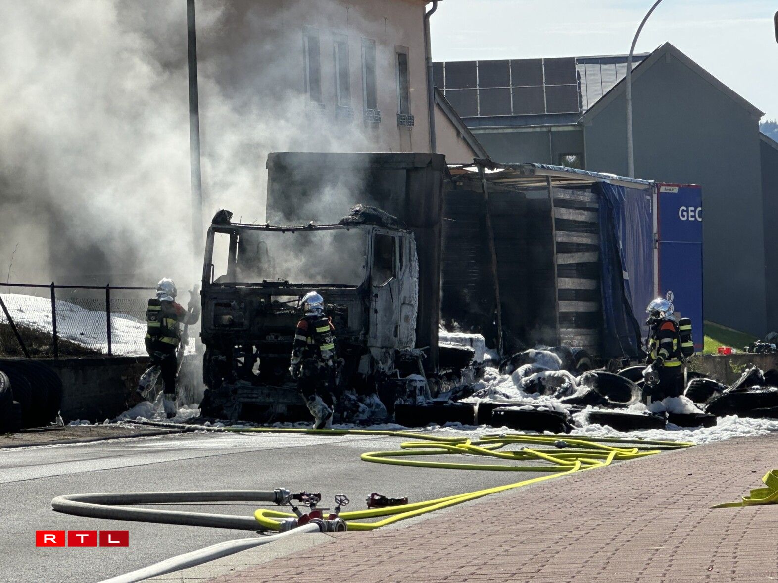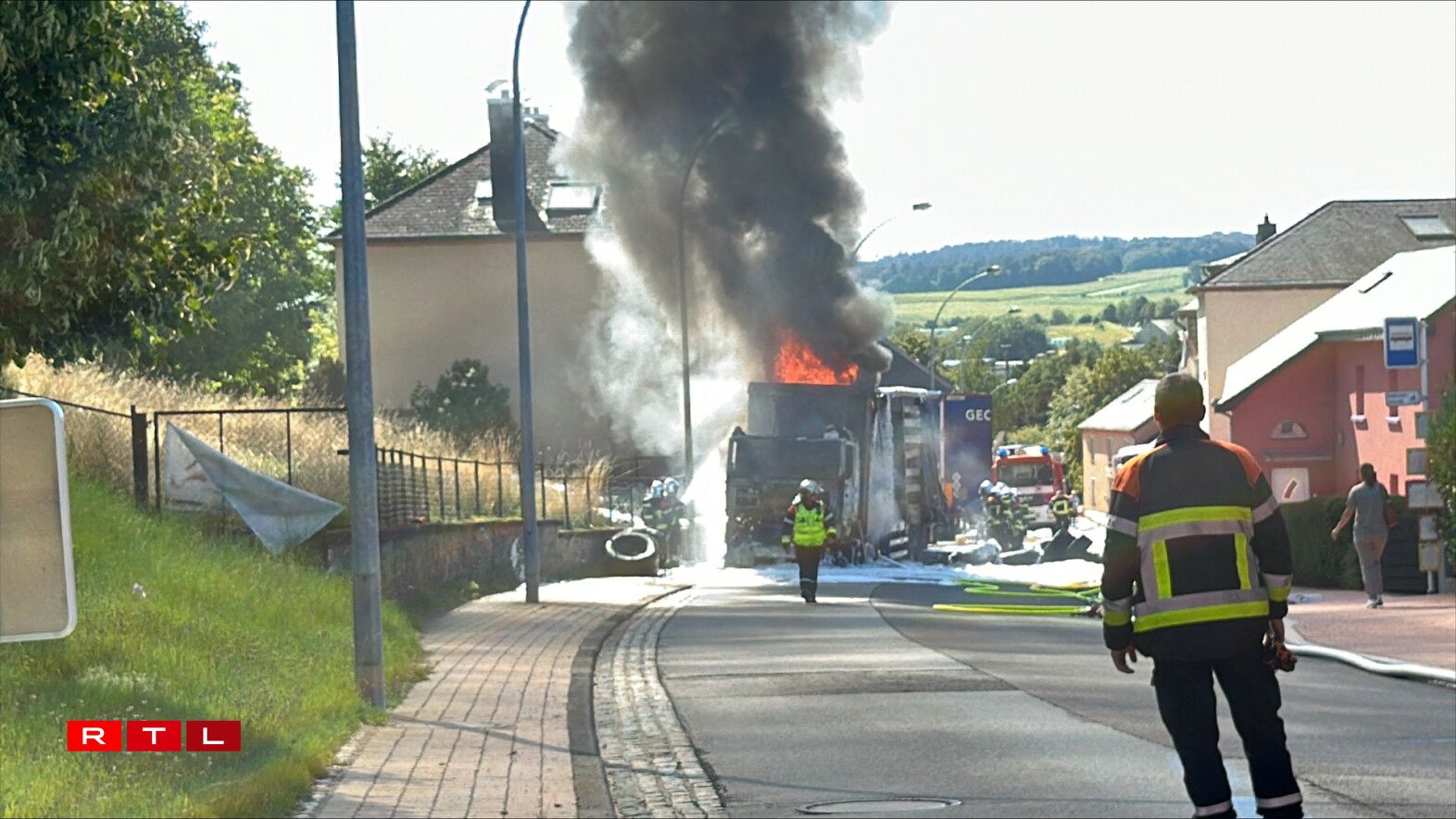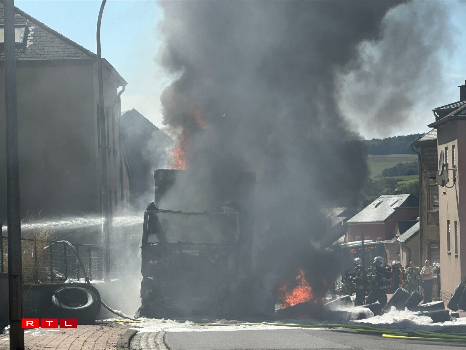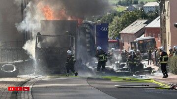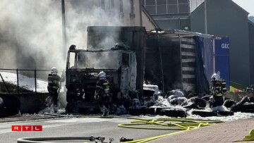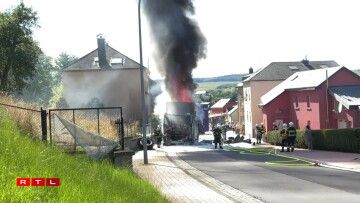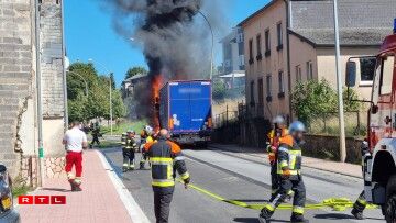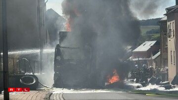 E Camion, dee Pneue gelueden huet, ass en Donneschdeg de Mëtteg Affer vun de Flame ginn.