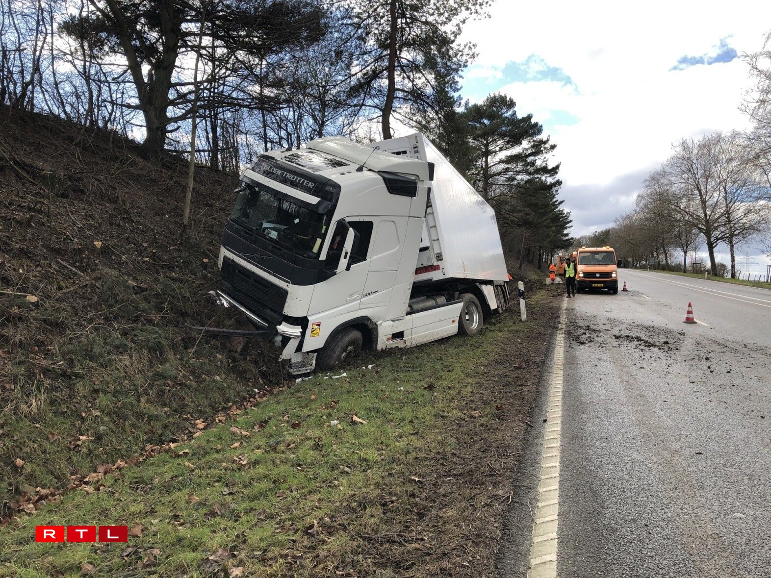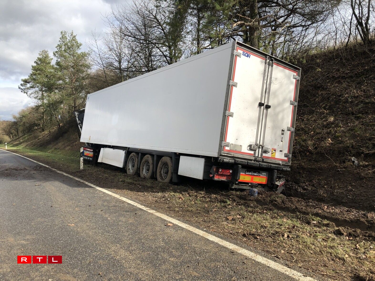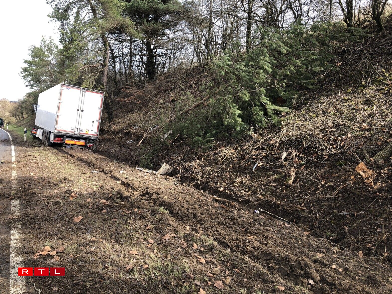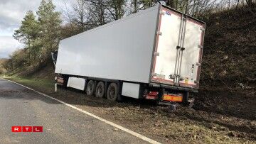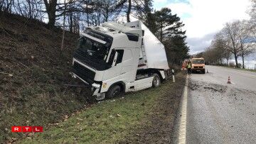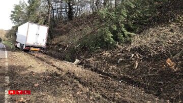 Hien ass an de Gruef geroden a krut dunn e Bam frontal ze paken. De Camion huet nawell en zolitte Schued dovugedroen, ma de Chauffer schéint éischten Informatiounen no net blesséiert ginn ze sinn.