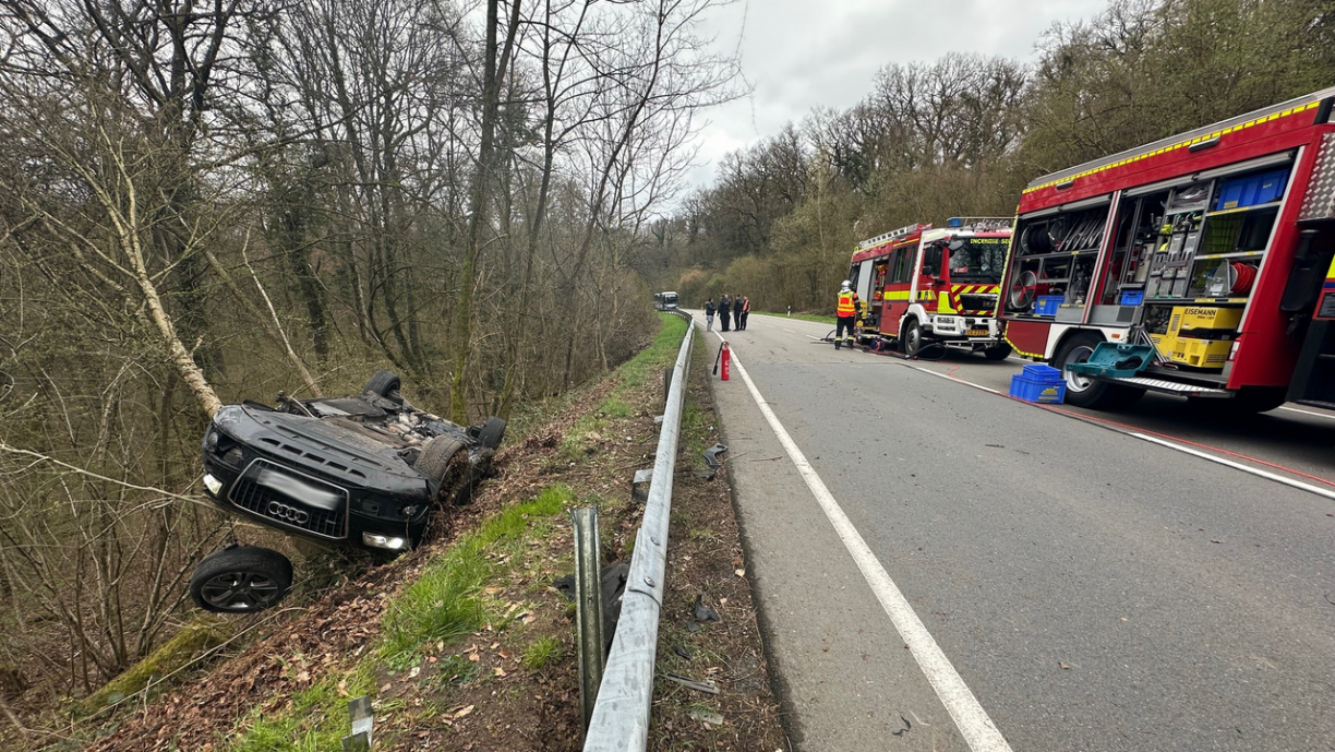 Dobäi ass den Auto op d’Géigespuer geroden, ass duerch d’Leitplank gerannt a koum ronn 80 Meter méi spéit um Daach zum stoen. Op der Plaz ware Pompjeeën an Ambulanz. Wéi et säitens der Police op Nofro heescht, goufen hei zwou Persoune blesséiert. De Samu war och op der Plaz.