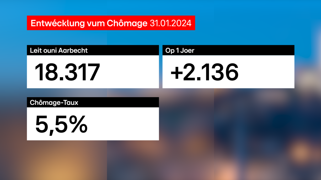 De Chômagetaux hei am Land läit weider bei 5,5%. Leschte Mount waren der ADEM no iwwer 18.300 Leit op der Sich no enger Aarbecht. Op e Joer gekuckt ass dat e Plus vu bal 16%. Eng Hausse, déi virun allem bei den héich qualifizéierten Demandeuren a bei de Jonken ënnert 30 Joer ze spieren ass. D’Secteuren, déi am meeschte betraff sinn, sinn ënnert anerem de Bau, de Finanz- an Immobiliësecteur, d’Industrie an d’Comptabilitéit.