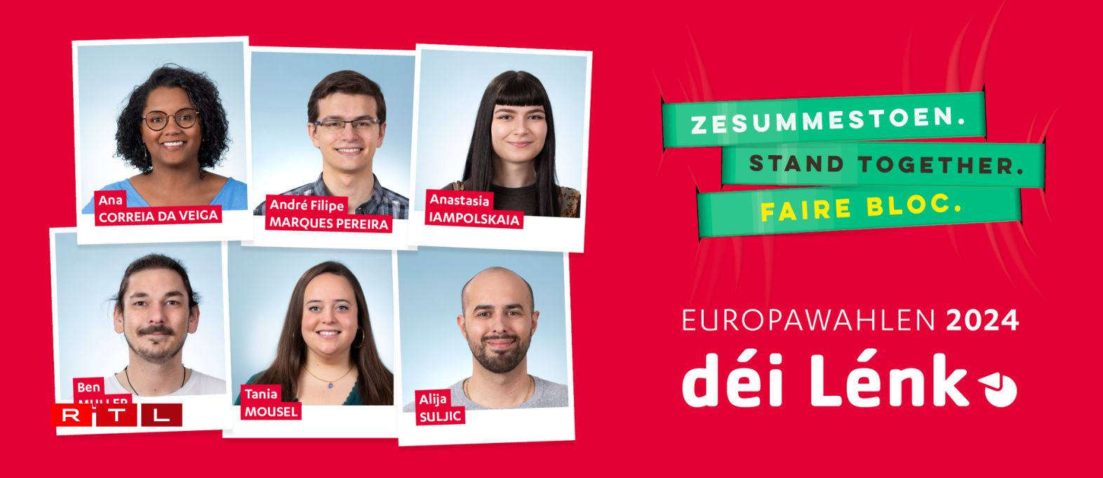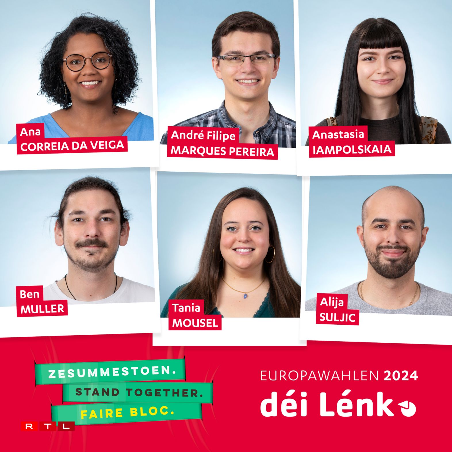 D’Kandidate sinn: d’Ana Correia da Veiga (41 Joer), den André Marques (28), d’Anastasia Iampolskaia (25), de Ben Muller (26); d’Tania Mousel (34) an den Alija Suljic (28).