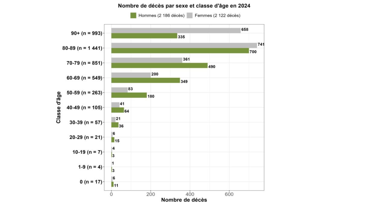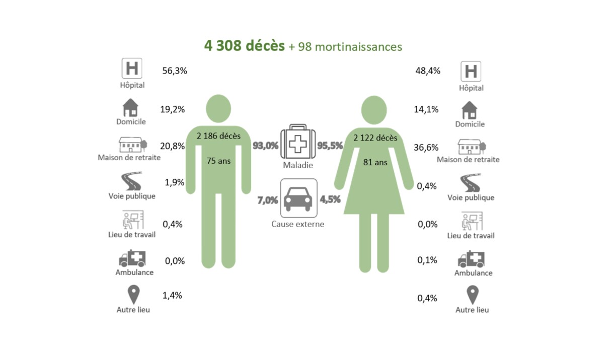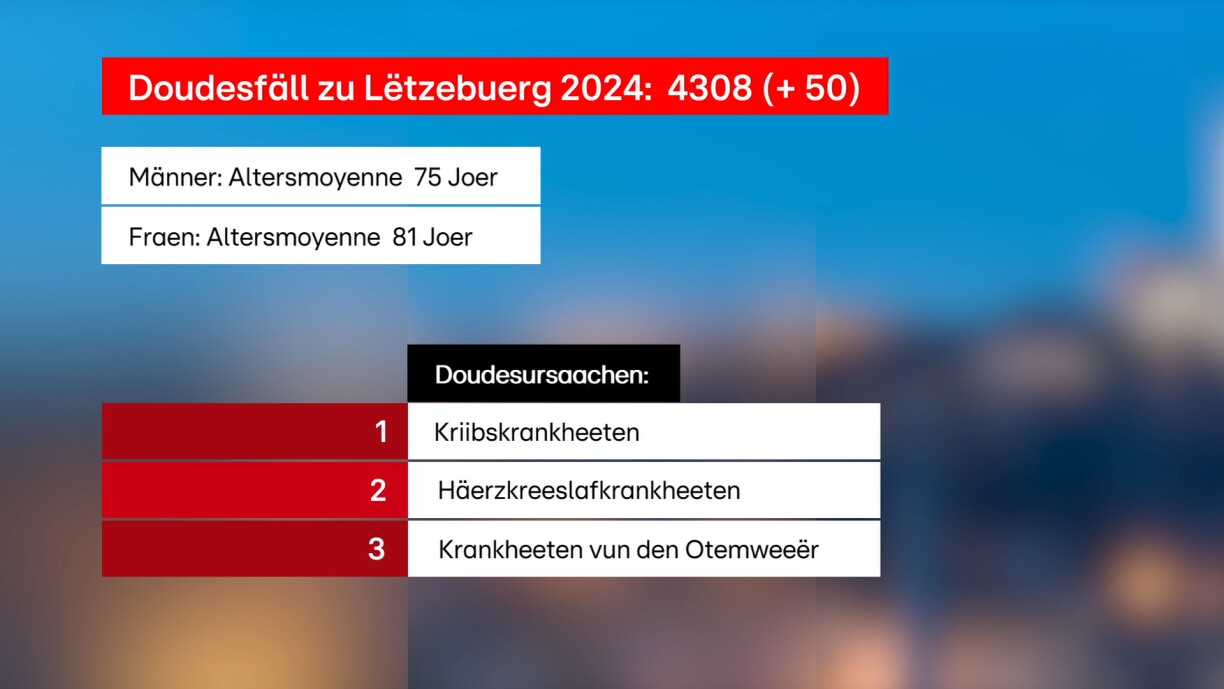 Am Joer 2024 huet d’Santé am Ganze 4.308 Doudesaffer um Lëtzebuerger Territoire gemellt kritt, dovunner 2.186 Männer an 2.122 Fraen. Dëst si 50 Stierffäll méi, wéi nach am Joer 2023. An der Moyenne stierwen d’Männer ëmmer nach éischter wéi d’Fraen: Bei de Männer läit den Alterduerchschnëtt beim Doud bei 75 Joer, Frae ginn an der Moyenne 81 Joer al. 2024 goufen et dann och nach 98 Doutgebuerten, déi allerdéngs net an déi offiziell Zuele mat afléissen.
