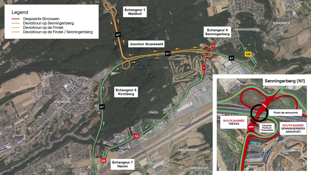Um Samschdeg gouf an deem Kontext den Tunnel, duerch deen den Tram spéider fuere wäert, bei der Sortie Findel/Sennengerbierg a seng definitiv Positioun bruecht. Dës Aarbechte sinn zanter dem fréien Nomëtte fäerdeg. Elo stinn d’Aarbechten um Pôle d’Echange “Héihenhaff” um Plang.