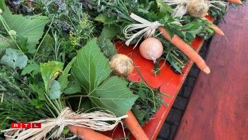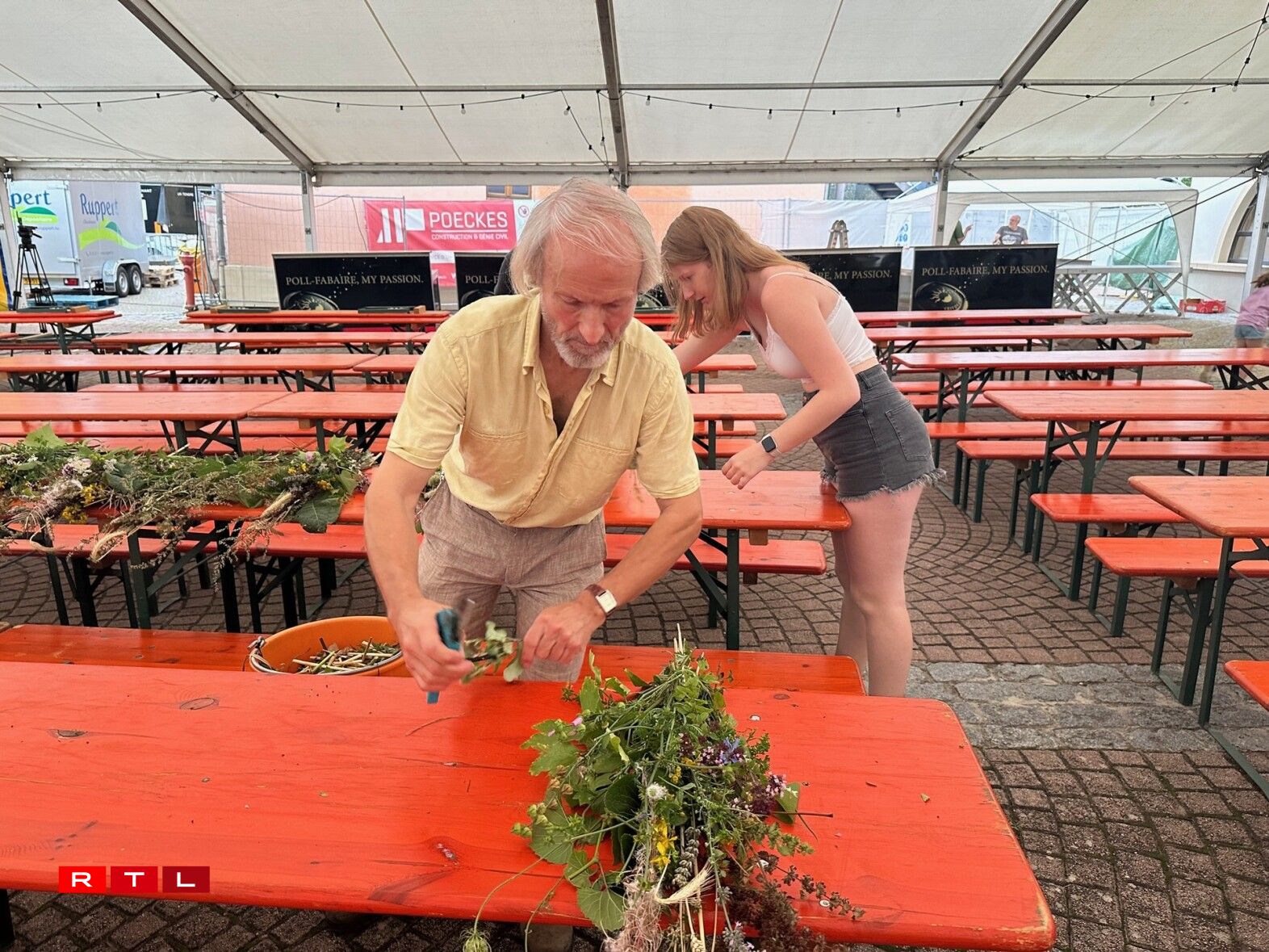 D’Preparatioune vum Fest waren e Méinden de Moie scho voll amgaangen. 110 Wësch goufen am Zentrum vum Duerf gebonnen. “De Wësch besteet aus enger 30 Kraider”, erkläert den Erny Konsbrück, wärend en e Strauch bënnt. Ma och Geescht, Kar, Huewer, Weess, eng Zwiwwel an eng Muert gehéieren dran.