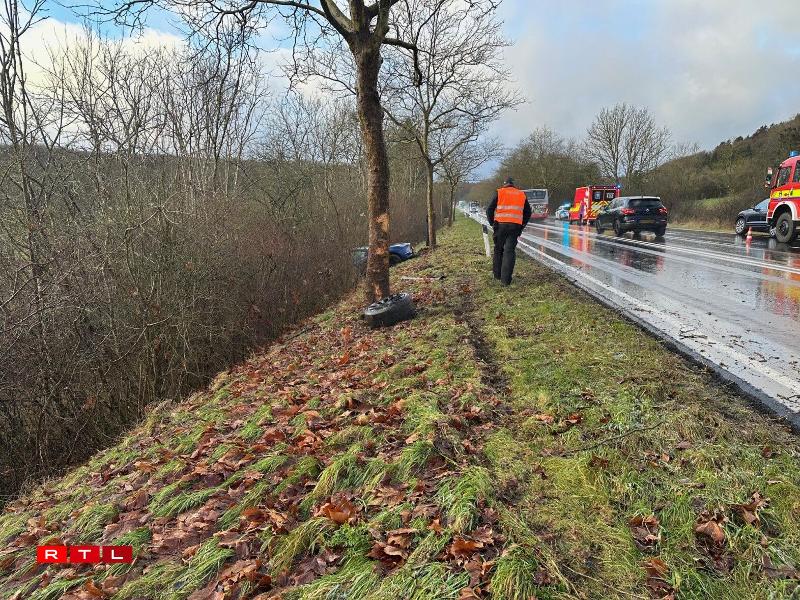 Éischten Informatiounen no ass ee vun de Ween op d’Géigespuer geroden, krut nach ee Bam ze paken an ass um Enn am Rampli gelant. De CGDIS huet duerno confirméiert, datt et beim Accident ee Blesséierte gouf. D’Pompjeeën an d’Ambulanz vu Jonglënster waren op der Onglécksplaz.